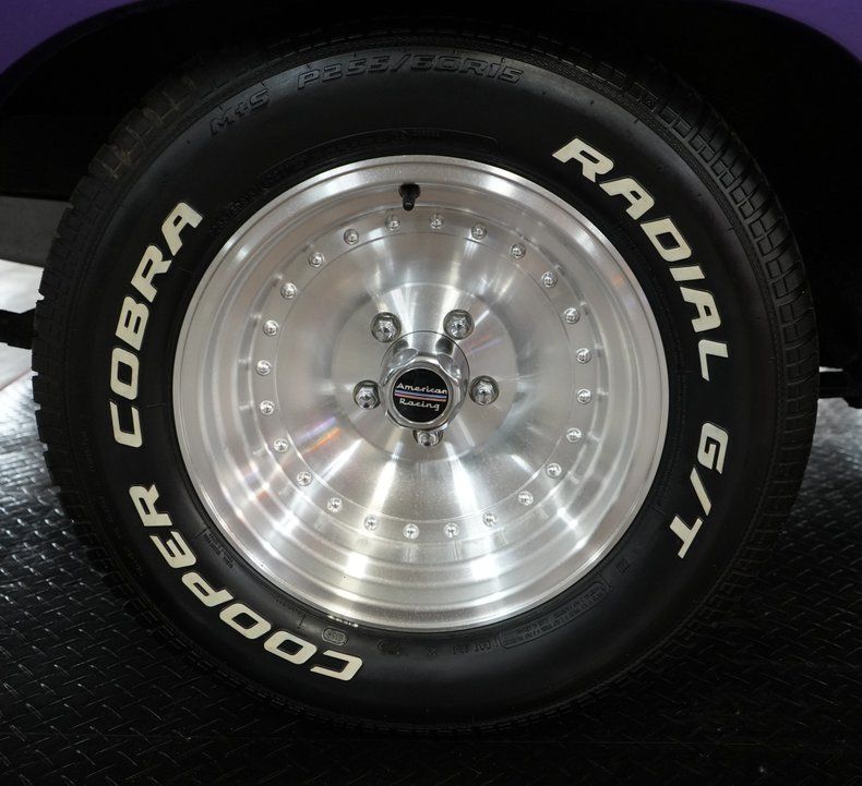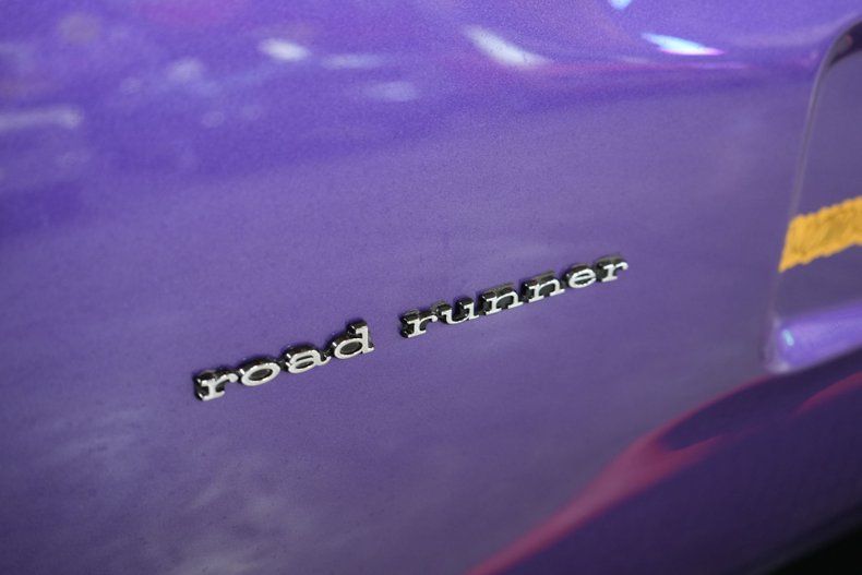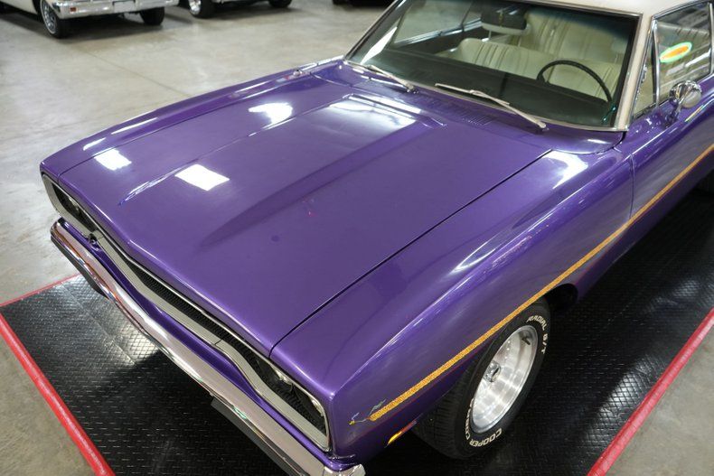 This 1970 Plymouth Roadrunner is a classic Mopar muscle car featuring its numbers matching 383 Magnum V8 and 727 Torqueflite automatic transmission. Backed by a Chrysler 8 3/4 rear end with a 2.76 gear ratio, it offers highway cruising power with vintage muscle. Equipped with power steering, front disc brakes, and rear drums, it balances performance and drivability. The car rides on 15" American Racing AR61 Outlaw wheels wrapped in Cooper Cobra Radial G/T tires. Finished in eye-catching Plymouth In-Violet paint with a white vinyl interior, this Roadrunner embodies true 1970s muscle. A rare and iconic piece of automotive history.