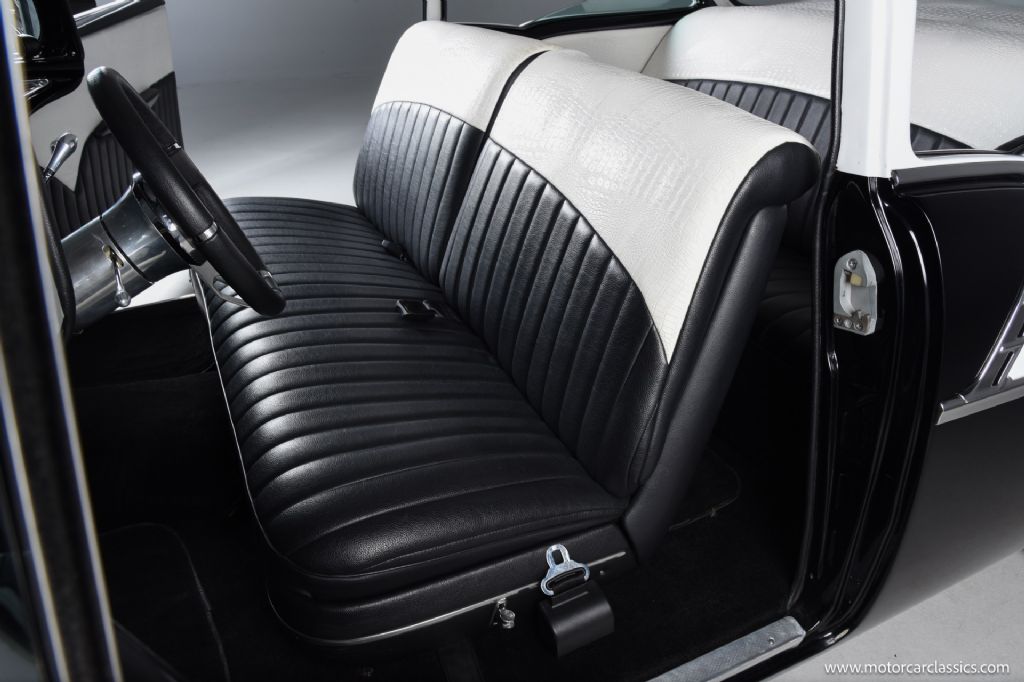 Inside, the custom interior is both stylish and functional, featuring power windows, power door locks, tilt steering column with a custom wheel, a front split-bench seat with lap belts, rear bench seating, and beautifully tailored black-and-white vinyl upholstery with matching carpeting. Additional amenities include an aftermarket gauge cluster, dashboard clock, retro-style Bluetooth radio, air ride controller, custom pedals, and a fully upholstered trunk designed to carry all your essentials for car shows.