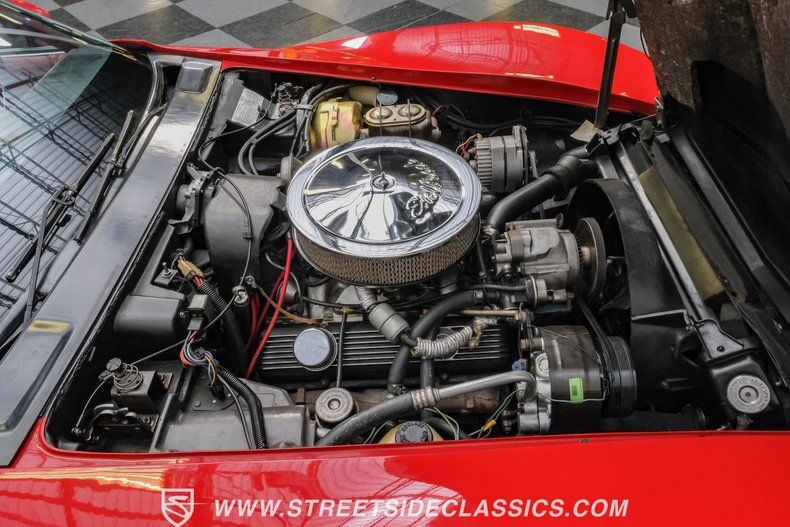 Numbers Matching L82 350 V8 Aluminum Intake Dual Exhaust FlowMasters TH350 Three Speed Auto Full Corvette Medium Red Repaint Four Wheel Disc Brakes Power Brakes Power Steering Likely Original Interior Leather Seats Provisions for Air Conditioning (Needs servicing to blow cold again) Color-Matched T-Tops Telescoping Steering Wheel Power Windows Power Locks Owner's Manual