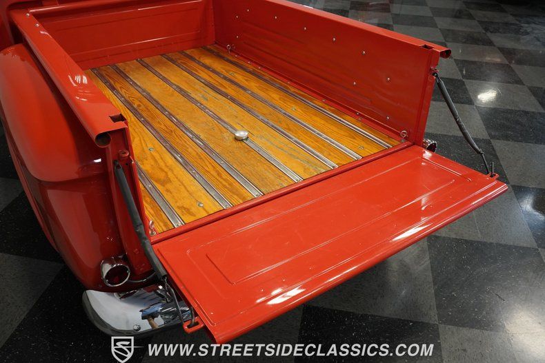 Finished in a full repaint with a deep high-gloss finish, the truck shows well as a driver with a chrome grille, polished American Racing wheels, and custom touches like relocated fuel filler access in the bed. A wood bed adds traditional style, while upgraded lighting and trim details bring a cleaner, updated appearance. The stance is enhanced with QA1 coilovers at each corner and a 4-link rear setup, giving the truck a confident, sporty posture.