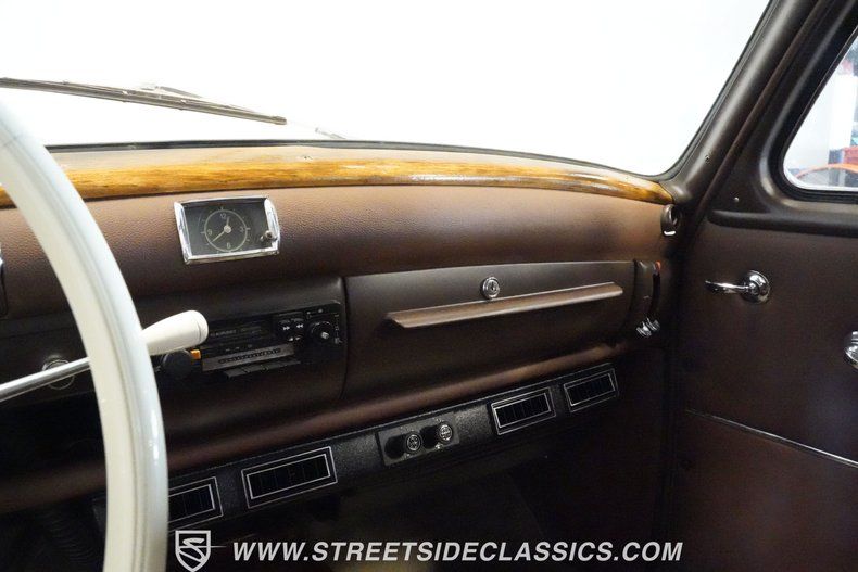 Inside, the cabin has been restored in brown leather-look vinyl with matching door panels, dash bezel, and trim. The tan headliner is tidy, while the original wood-grain dash retains a touch of patina that ties back to its heritage. Seating and carpet present well, making this interior both stylish and comfortable for touring. A discreet aftermarket stereo has been fitted to add modern listening without disrupting vintage appeal.