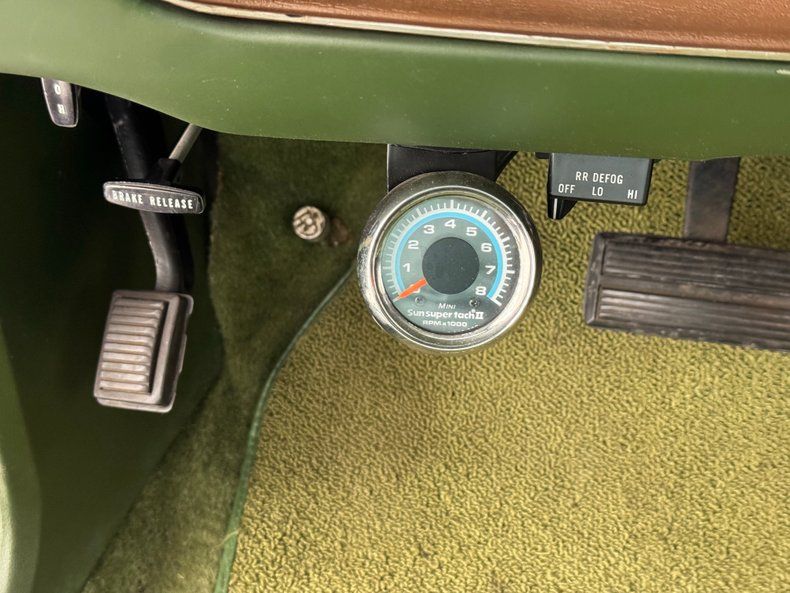 Green vinyl and plastic with a broad swath of imitation woodgrain trim on the doors screams early 70's and just gives warm fuzzies to those of us who grew up then. The front seats feature green cloth inserts in a green vinyl base and are technically a split bench, but the seat tops are split wide and are configured like a high back bucket with center armrest, quite unique. Like the fronts, the back bench looks pristine and borrows materials from the front, along with woodgrain trim on walls and faux stitched design. The simple steering wheel hints of the Dodge 3 point logo with, also called a Fratzog, a name Dodge invented, and in this case, made of faux woodgrain. The gauge cluster is surrounded by sculpted and textured brown plastic which also contrasts with the green dash and keeps with the color palette for the interior. Simple gauges and an AM radio are in place, along with vent and heat controls as the A/C option was not selected. An aftermarket tachometer has been added and mounted below the dash as an optional clock takes up the second large circle on the dash. Plush green carpet is lovely and protected by loop style carpeted mats, in a lighter shade of green, and absorbing any wear the 27,000 miles may have brought. The headliner and visors are minty mint.