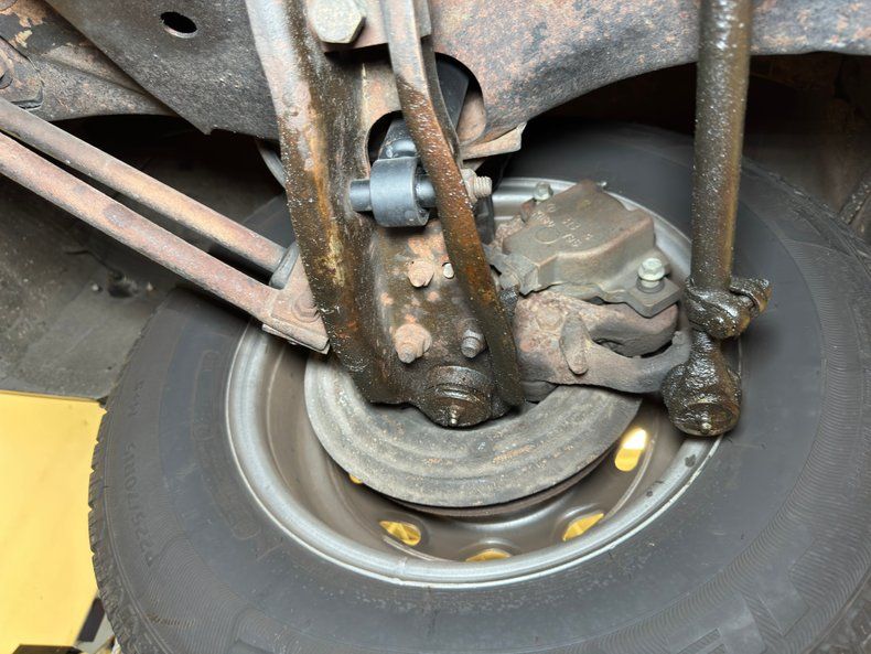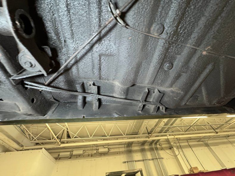 There's some patina on this clean underside and some typical surface rust. There's a thin coating of residual oil on the oil and transmission pans and some oil drift from the front U-joint area has accumulated on the dual exhaust and created a harmless linear stain. The dual exhaust continues to a pair of FlowMaster mufflers before exiting through big, slightly beveled tailpipes. Torsion bar suspension is up front and leaf springs are mounted outback to provide the ride.