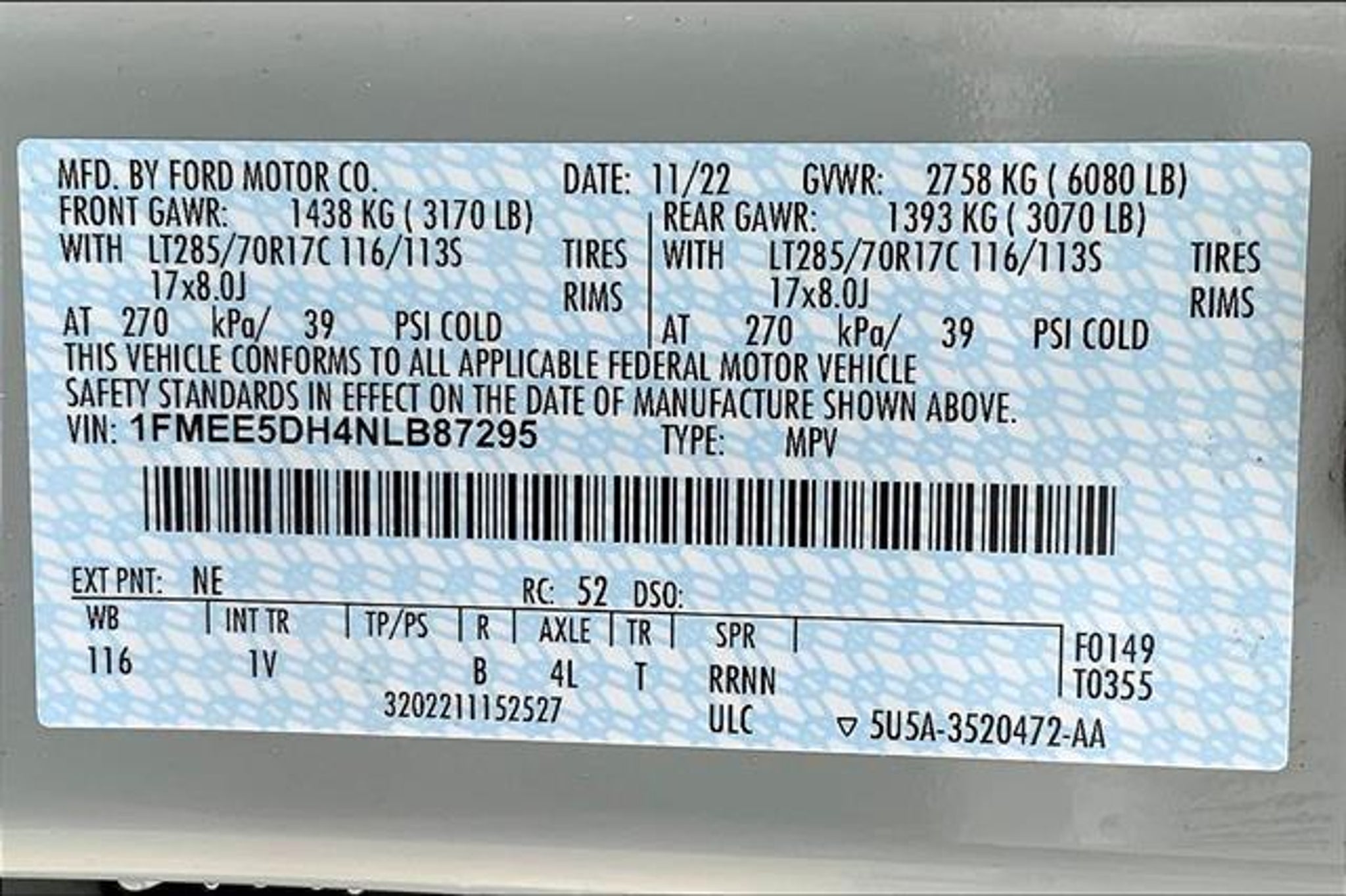 VIN 1FMEE5DH4NLB87295