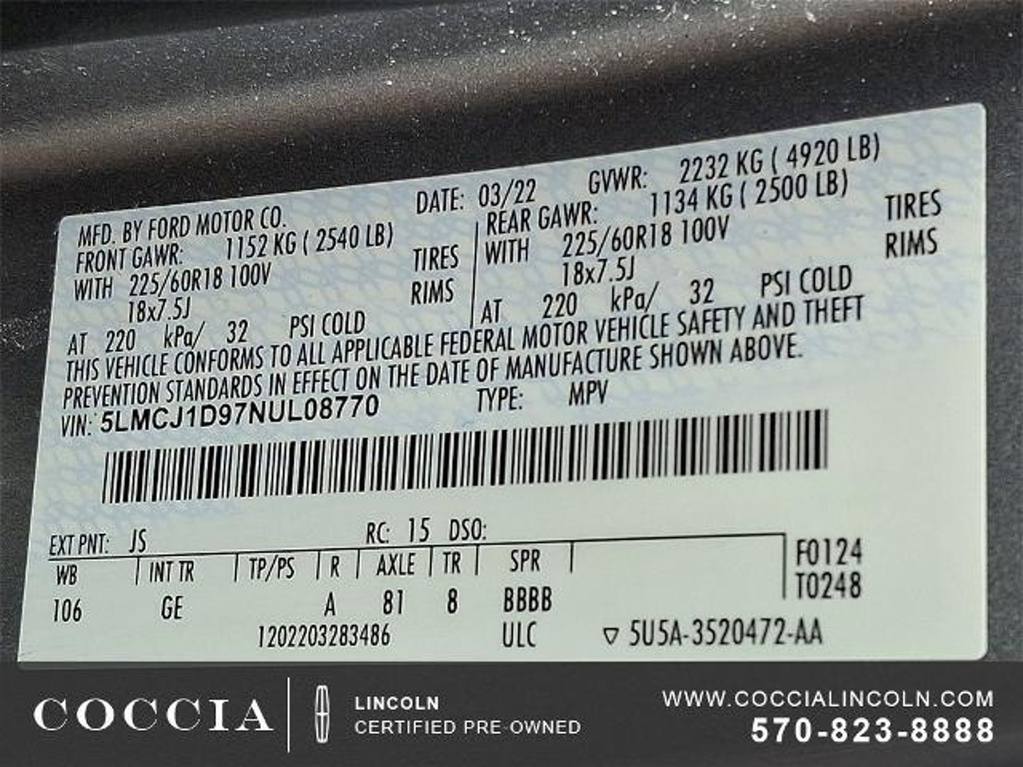 Lincoln Certified Pre-Owned Vehicles include a 6-year/100,000 mile* Powertrain Limited Warranty Coverage, 12-month/12,000- mile Comprehensive Limited Warranty Coverage, 200-Point Vehicle Inspection, Vehicle History Report, and 24/7 Roadside Assistance. COCCIA is Family Owned, Customer Driven. Certified. Odometer is 11946 miles below market average! 4D Sport Utility AWD 2.0L I4 8-Speed Automatic 21/29 City/Highway MPG One Owner, Clean Vehicle History Report, Buy at Coccia and receive complimentary inspections for the life of your vehicle, Complimentary car wash with every service visit, Convenient Saturday service department hours available, Family owned and operated for over 35 years!, 10 Speakers, 18 Bright Machined Aluminum Wheels, 3.81 Axle Ratio, 60/40 EasyFold Rear Seat w/Power Seatback Release, Air Conditioning, Alloy wheels, AM/FM radio: SiriusXM, Auto High-beam Headlights, Auto-dimming Rear-View mirror, Automatic temperature control, Brake assist, Bumpers: body-color, Compass, Convenience Package, Delay-off headlights, Driver door bin, Driver vanity mirror, Electronic Stability Control, Elements Package, Equipment Group 101A, Four wheel independent suspension, Front Bucket Seats, Front Center Armrest, Front dual zone A/C, Front reading lights, Fully automatic headlights, Heated door mirrors, Heated front seats, Heated Rear Seat, Heated Steering Wheel, Heated/Ventilated Driver & Front Passenger Seats, Illuminated entry, Memory seat, Micro-Perforated Lincoln Soft Touch Seats, Outside temperature display, Overhead console, Panic alarm, Passenger door bin, Passenger vanity mirror, Power door mirrors, Power driver seat, Power Liftgate, Power passenger seat, Power steering, Power windows, Radio data system, Radio: Lincoln Premium Audio System w/MP3, Rain Sensing Wipers, Rear Parking Sensors, Rear reading lights, Rear seat center armrest, Rear window defroster, Rear window wiper, Remote keyless entry, Roof rack: rails only, Security system, SiriusXM Radio, Speed control, Speed-sensing steering, Speed-Sensitive Wipers, Split folding rear seat, Spoiler, Steering wheel mounted A/C controls, Steering wheel mounted audio controls, SYNC 3 Communications & Entertainment System, Tachometer, Telescoping steering wheel, Tilt steering wheel, Traction control, Trip computer, Universal Garage Door Opener, Variably intermittent wipers, Voice-Activated Touchscreen Navigation System, Windshield Wiper De-Icer. COCCIA is Family Owned, Customer Driven.