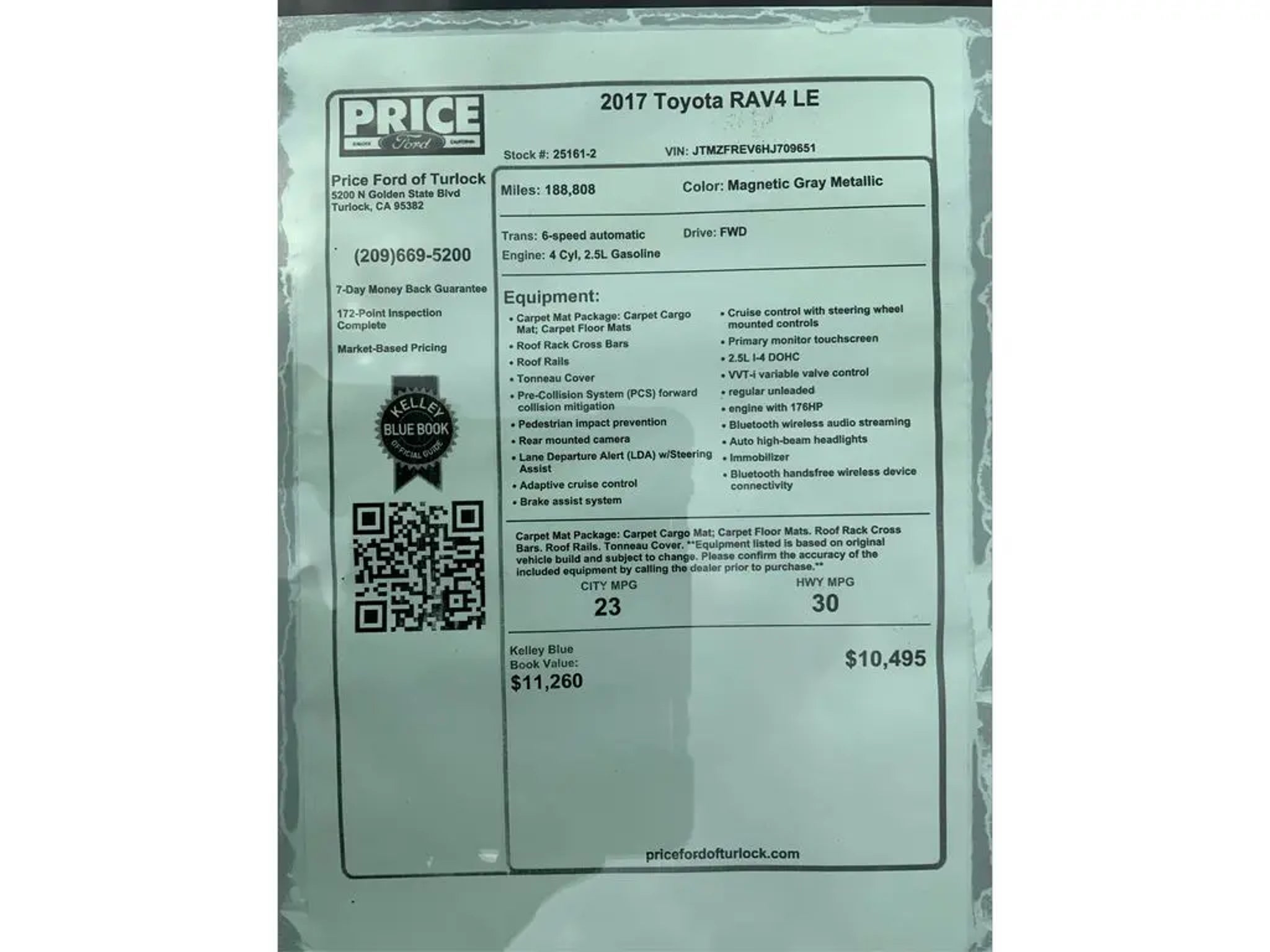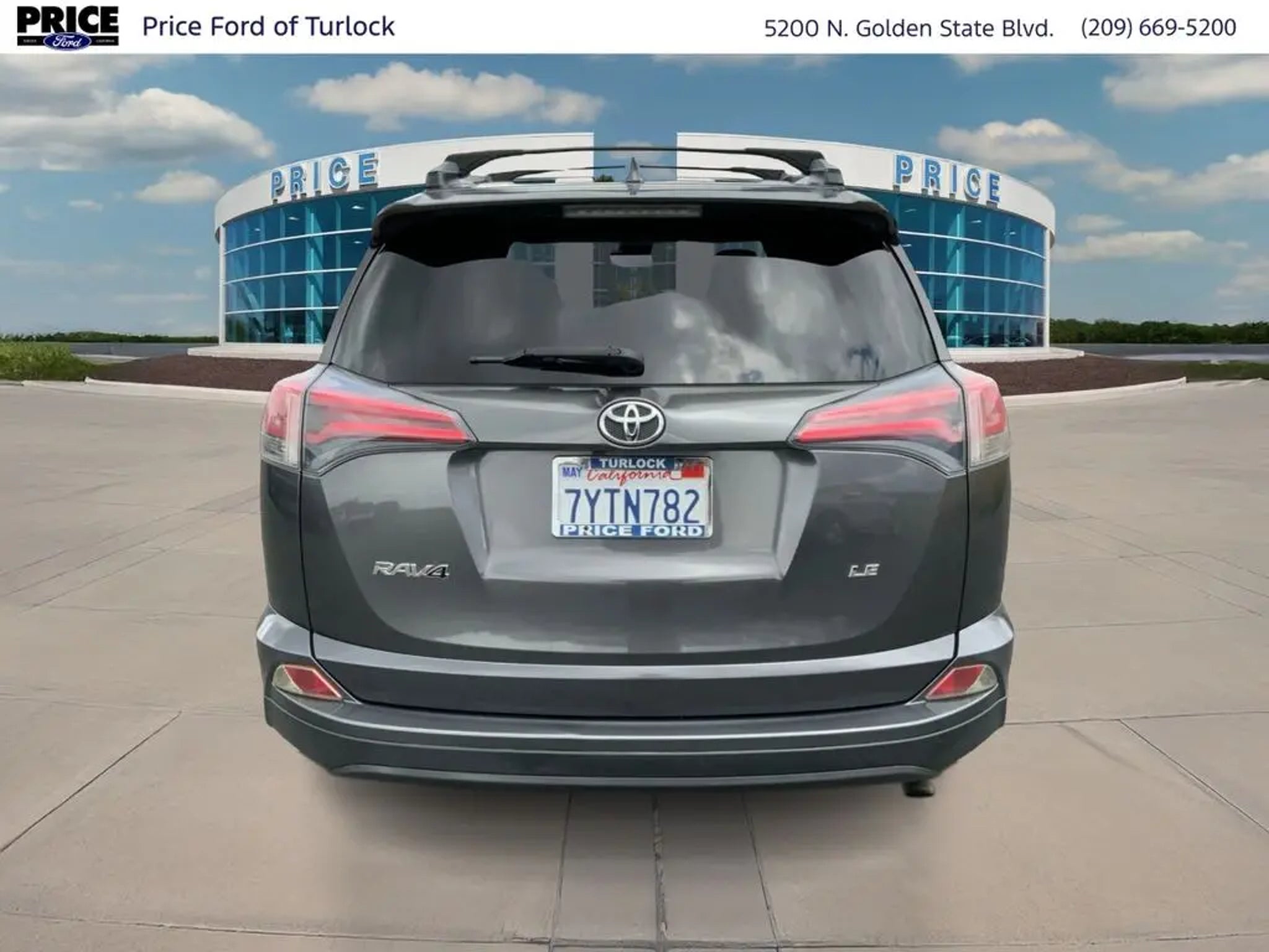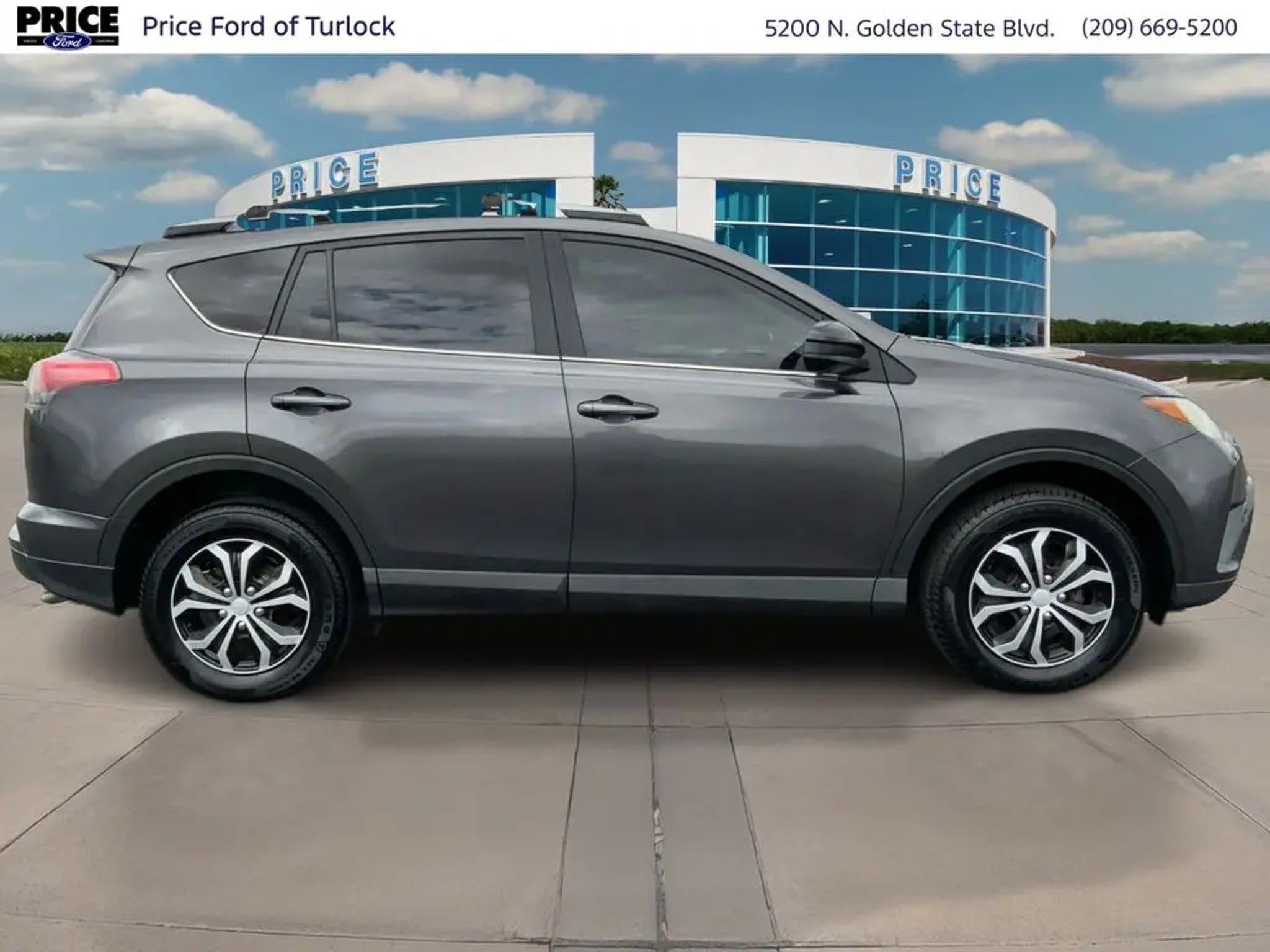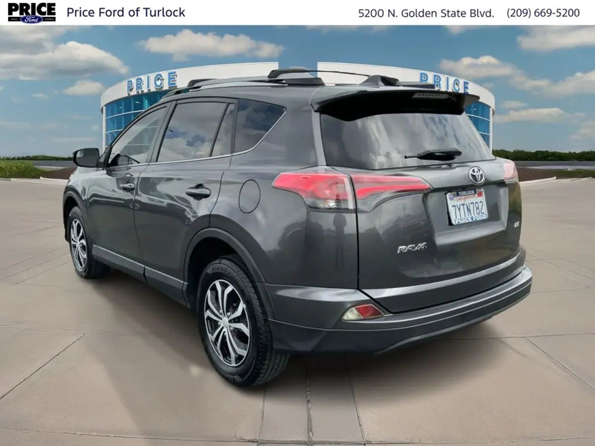 Equipment See what's behind you with the back up camera on this model. It has auto-adjust speed for safe following. This 2017 Toyota RAV4 features a hands-free Bluetooth phone system. The Toyota RAV4 projects refinement with a racy metallic gray exterior. This unit is front wheel drive. This Toyota RAV4 has a 4 Cyl, 2.5L high output engine. Maintaining a stable interior temperature in it is easy with the climate control system. Make room for more passengers, carry extra luggage or your favorite sports gear with the roof rack on this Toyota RAV4. Enjoy the tried and true gasoline engine in it. This vehicle features cruise control for long trips. The high efficiency automatic transmission shifts smoothly and allows you to relax while driving. Electronic Stability Control is one of many advanced safety features on it. The perfect balance of space and size. the Toyota RAV4 cruises through the city with ease. Packages Carpet Mat Package: Carpet Cargo Mat; Carpet Floor Mats. Roof Rack Cross Bars. Roof Rails. Tonneau Cover. **Equipment listed is based on original vehicle build and subject to change. Please confirm the accuracy of the included equipment by calling the dealer prior to purchase.** Additional Information Price Ford of Turlock is the newest Ford Dealer located in the heart of the Central Valley and we promise to work the hardest to be your dealer. Once you compare our prices online, you will see we are priced competitively in the market. But more importantly, our pre-owned vehicles have all been serviced by factory trained technicians and passed an extensive pre-owned checklist. All of our pre-owned vehicles come with a complimentary 7-day Money Back Guarantee and all vehicles newer than 10 years old and under 100,000 miles come with a 3mo/3,000 mile Limited Used Vehicle Warranty. If you have any questions about the vehicle, its pricing, finance options, or service contract eligibility, please email us a