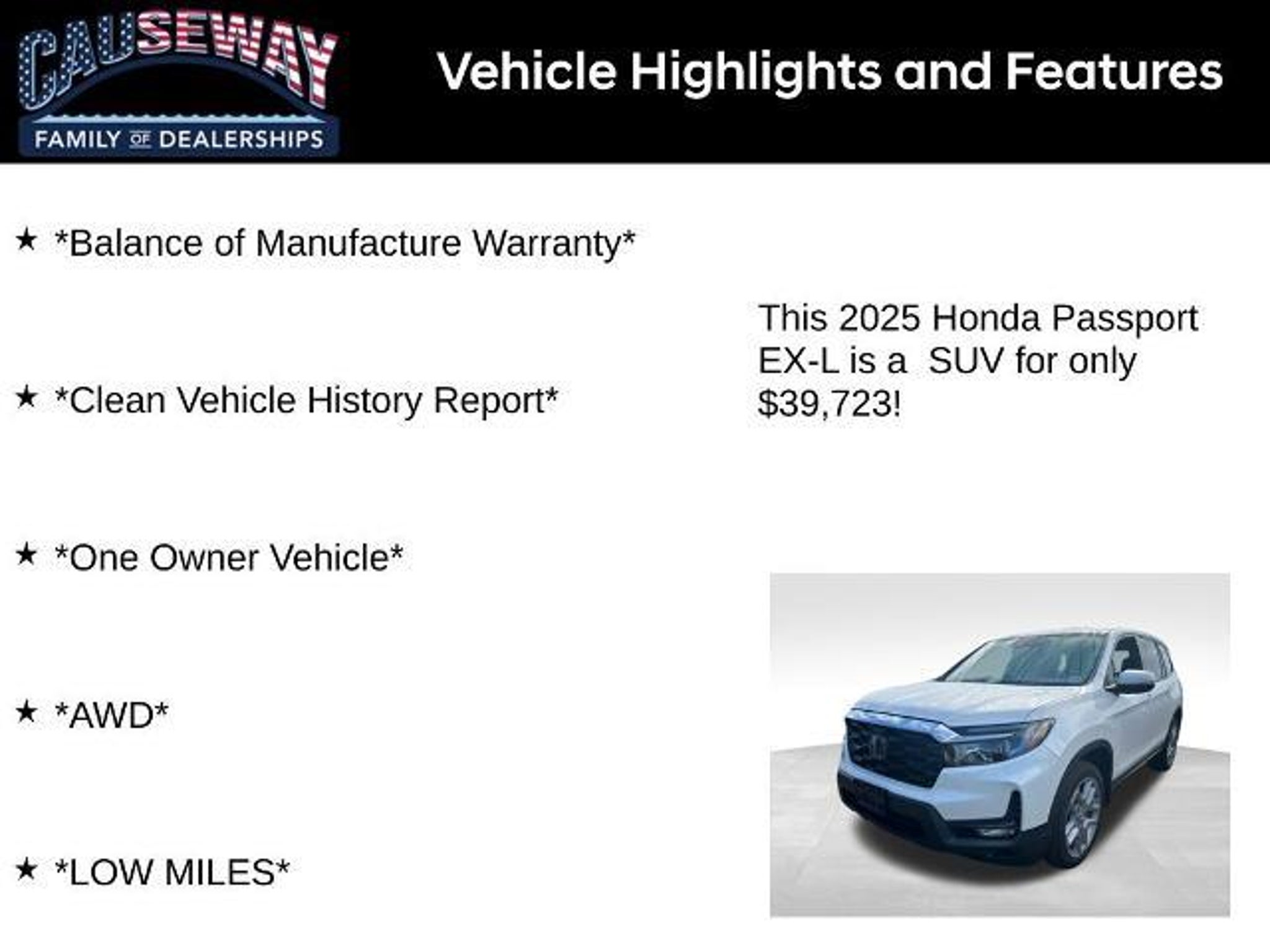 2025 Honda Passport EX-L Adventure Meets Luxury Experience the perfect combination of capability, comfort, and technology with the 2025 Honda Passport EX-L. Finished in Platinum White Pearl and boasting a leather interior, this one-owner AWD SUV offers low miles and the balance of manufacturer warranty, delivering peace of mind along with style and performance. Key Highlights Odometer: 27,836 miles well below average for a 2025 model Engine: 3.5L V6 24V SOHC i-VTEC for smooth and responsive power Transmission: 9-Speed Automatic for seamless shifting Drivetrain: AWD for confidence in all road conditions Fuel Efficiency: Competitive performance for its class Interior Comfort & Convenience Luxurious leather interior Front dual-zone automatic climate control with rear air conditioning and rear window defroster Power driver seat and steering wheel-mounted audio controls Remote keyless entry and speed control Apple CarPlay & Android Auto for seamless smartphone integration CabinControl A/V remote for added convenience Entertainment & Technology 215-Watt Audio System with 7 Speakers AM/FM Radio, SiriusXM, and Radio Data System HondaLink Assist emergency communication system for added safety Safety Features 4-Wheel Disc Brakes with ABS Dual front and side airbags, overhead airbags, and occupant sensing airbags Blind Spot Information (BSI) System for safer lane changes Front and rear anti-roll bars for improved stability Low tire pressure warning and brake assist for enhanced peace of mind Electronic Stability Control Exterior & Styling Power moonroof and Power Liftgate for convenience and style Fully automatic headlights with auto high-beam and delay-off features Heated power door mirrors with turn signal indicators Body-color bumpers and rear spoiler 20 Sparkle Silver Alloy Wheels for a bold, commanding look Rear window wiper for improved visibility With low mileage, AWD capability, and EX-L luxury features, this 2025 Honda Passport is engineered to take you on every adventure in comfort, confidence, and style. Take the next stepschedule your test drive today and experience the ultimate in Honda capability and refinement!