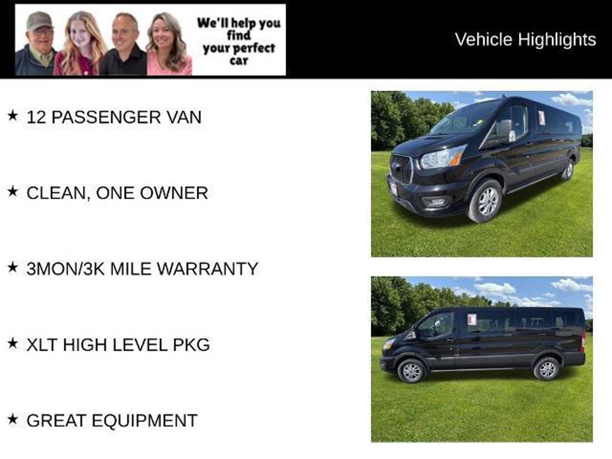 As always - ABSOLUTELY NO FEES! This 2021 Ford Transit-350 XLT 12 PASSENGER is a true workhorse that's ready to take on any task you throw its way. With its impressive V6 engine, 10-speed automatic transmission, and rear-wheel drive, this van delivers the power and capability you need to conquer the road. - BLUETOOTH - SYNC 3 - CLEAN CARFAX - 12 PASSENGER VAN - CLEAN, ONE OWNER - 3MON/3K MILE WARRANTY - XLT HIGH LEVEL PKG - GREAT EQUIPMENT - POWER RUNNING BOARDS - PRIVACY GLASS - WHEELS: 16 SILVER ALUMINUM ALLOY - RADIO: AM/FM STEREO W/HD/SIRIUSXM & 8 SCREEN This Transit-350 is loaded with features that make it the perfect choice for your business or family. The SYNC 3 infotainment system keeps you connected and entertained, while the power running boards and privacy glass add both style and functionality. With seating for up to 12 passengers, this van offers ample space for all your passengers and cargo. The clean CARFAX history report and one-owner status give you the peace of mind that this Transit-350 has been well-maintained and cared for. And with the included 3-month/3,000-mile warranty, you can drive with confidence knowing that your investment is protected. Whether you're transporting a large crew, hauling equipment, or simply need a spacious and capable van, this 2021 Ford Transit-350 XLT 12 PASSENGER is the perfect solution. Come in and take it for a test drive today ? you won't be disappointed. As always - ABSOLUTELY NO FEES!