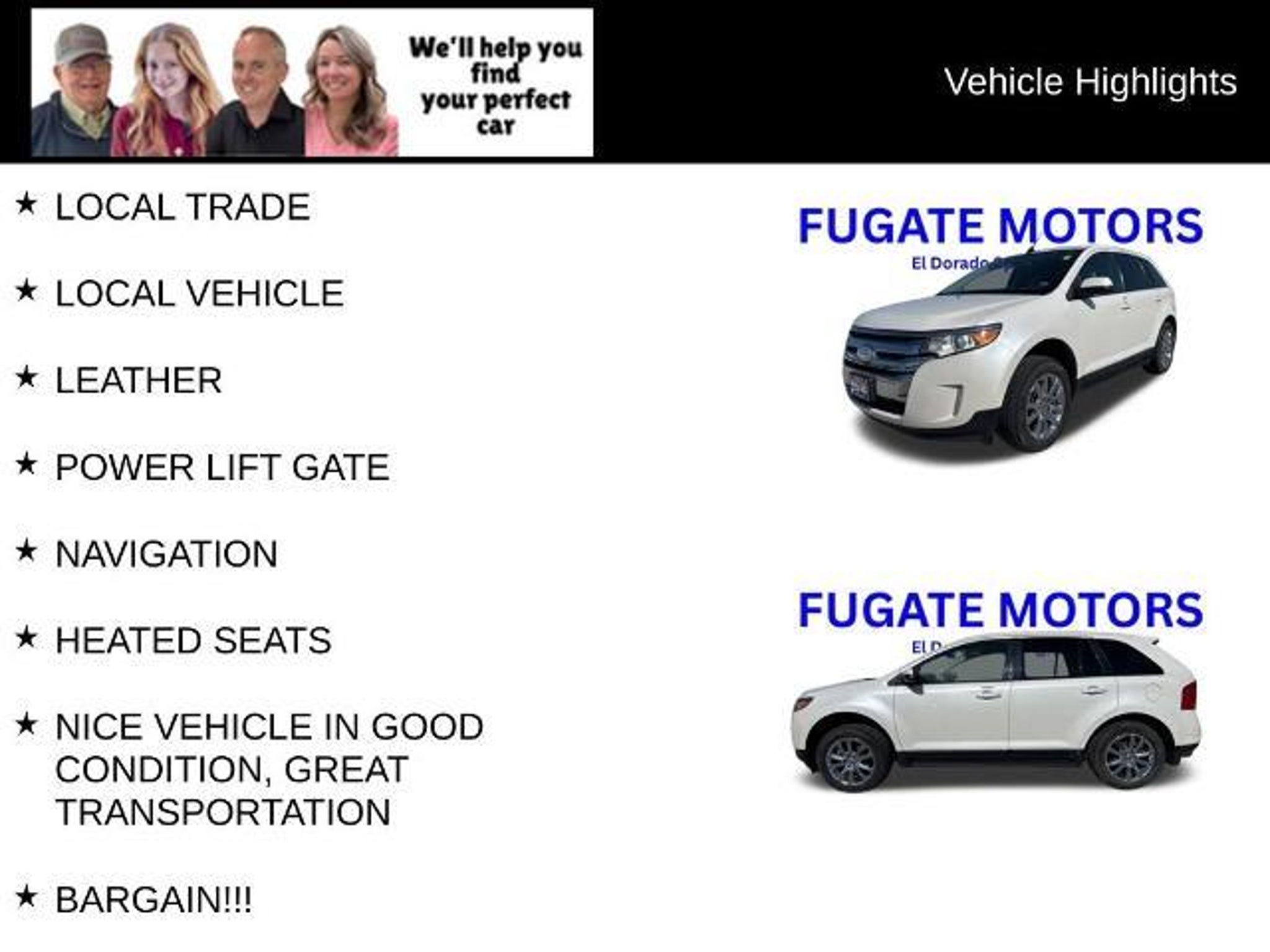 LOCAL TRADE-IN. CLEAN VEHICLE. NICELY EQUIPPED WITH HEATED LEATHER SEATS, POWER LIFTGATE, DUAL CLIMATE CONTROL AND MORE. CALL TO SCHEDULE YOUR TEST DRIVE. NO BUYER FEES! NO DOC FEES!! NO FEES!!! Since 1963 we have been serving El Dorado Springs, Stockton, Wheatland, Bolivar, Lebanon, Warsaw, Joplin, Springfield, Nixa, Ozark, Branson, Kansas City, Nevada, Belton, Harrisonville, Raytown, Lees Summit, Blue Springs, Fayetteville, Tulsa and more!!!! Equipment Group 205A (Rear-View Camera), Leather Comfort Package (Leather-Trimmed Heated Bucket Seats), 18 Chrome-Clad Wheels, 18 Painted Aluminum Wheels, 3.16 Axle Ratio, 4-Wheel Disc Brakes, 6 Speakers, ABS brakes, Air Conditioning, Alloy wheels, AM/FM radio: SiriusXM, AM/FM Stereo w/Single CD/MP3/Navigation, Auto-dimming Rear-View mirror, Automatic temperature control, Brake assist, Bumpers: body-color, CD player, Compass, Delay-off headlights, Driver door bin, Driver vanity mirror, Dual front impact airbags, Dual front side impact airbags, Electronic Stability Control, Four wheel independent suspension, Front anti-roll bar, Front Bucket Seats, Front Center Armrest w/Storage, Front dual zone A/C, Front License Plate Bracket, Front reading lights, Fully automatic headlights, Heated door mirrors, Illuminated entry, Integrated SIRIUS Travel Link, Low tire pressure warning, Occupant sensing airbag, Outside temperature display, Overhead airbag, Overhead console, Panic alarm, Passenger door bin, Passenger vanity mirror, Power door mirrors, Power driver seat, Power Liftgate, Power steering, Power windows, Radio: AM/FM Stereo w/Single CD/MP3 Capable, Rear anti-roll bar, Rear Parking Sensors, Rear reading lights, Rear seat center armrest, Rear window defroster, Rear window wiper, Remote keyless entry, Speed control, Speed-Sensitive Wipers, Split folding rear seat, Spoiler, Steering wheel mounted audio controls, SYNC Services, Tachometer, Telescoping steering wheel, Tilt steering wheel, Traction control, Trip computer, Unique Cloth Bucket Seats, and Variably intermittent wipers.