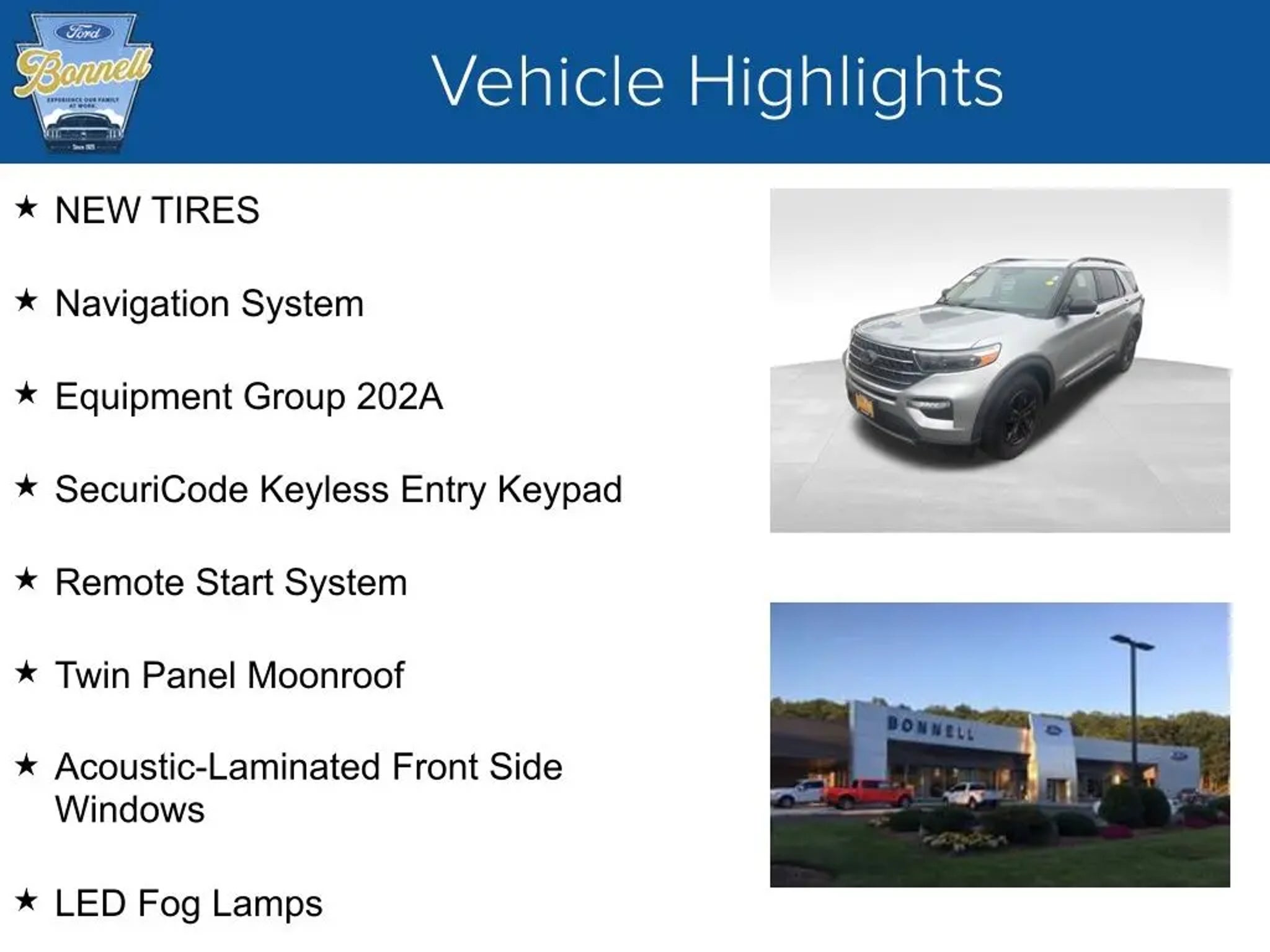 Ford Blue Advantage Gold Certified!! Iconic Silver Metallic 2022 Ford Explorer XLT 4WD 10-Speed Automatic 2.3L EcoBoost I-4 NEW TIRES, 4WD, 1st Row Heated Seats, 2nd Row 35/30/35 Bench w/E-Z Entry & Armrest, Acoustic-Laminated Front Side Windows, ActiveX Captain's Chairs, Equipment Group 202A, Heated front seats, Heated Steering Wheel, LED Fog Lamps, Navigation System, Remote Start System, SecuriCode Keyless Entry Keypad, Twin Panel Moonroof. 20/27 City/Highway MPG