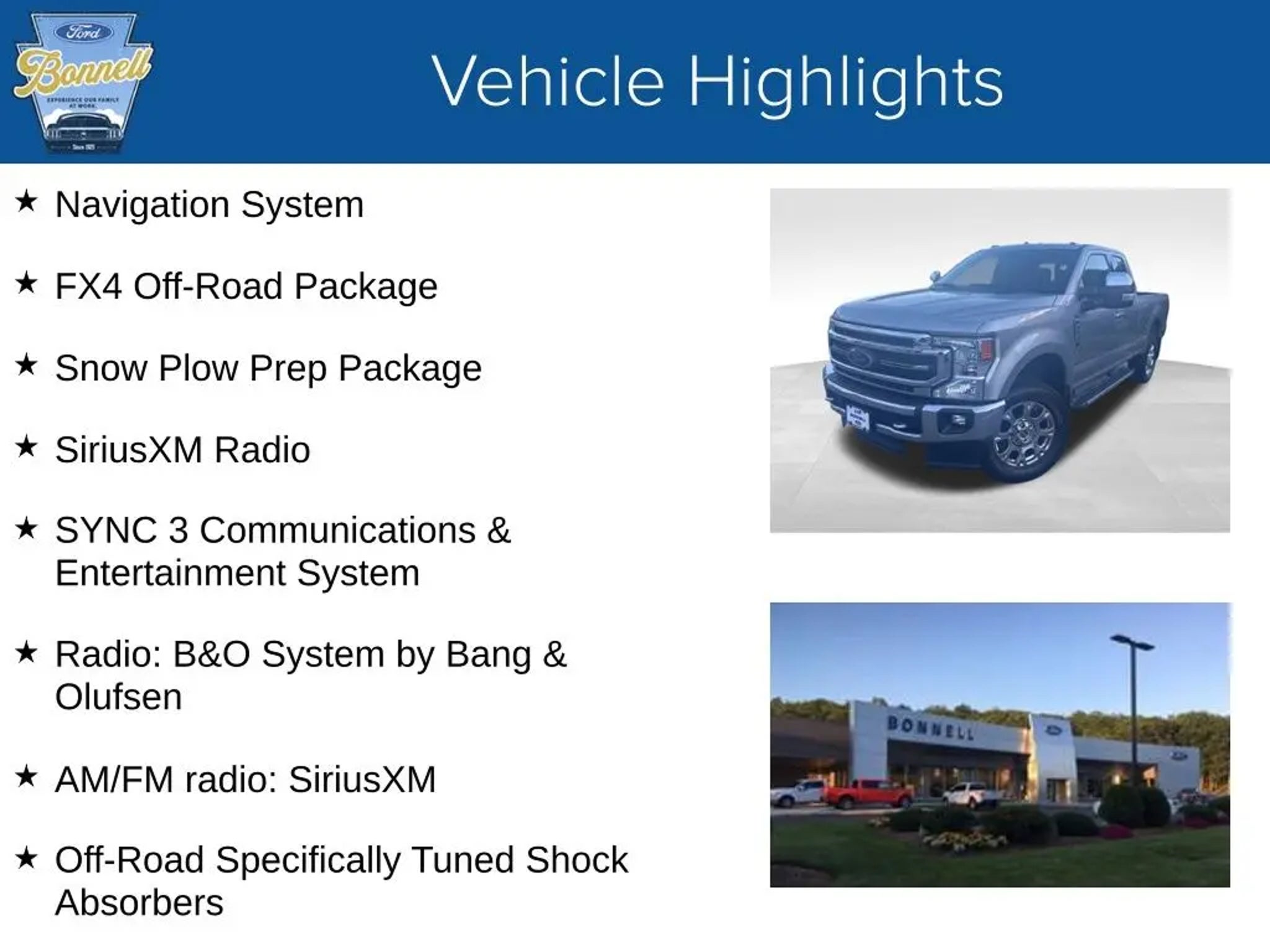 Iconic Silver Metallic 2020 Ford F-250SD Lariat 4WD 10-Speed Automatic 7.3L V8 PFI SOHC 16V Federal 385hp 4WD, 110V/400W Outlet, AM/FM radio: SiriusXM, FX4 Off-Road Package, Heated Steering Wheel, Hill Descent Control, Navigation System, Off-Road Specifically Tuned Shock Absorbers, Power Heated/Ventilated Driver Seat w/Memory, Radio: B&O System by Bang & Olufsen, SiriusXM Radio, Snow Plow Prep Package, SYNC 3 Communications & Entertainment System, Unique FX4 Off-Road Box Decal, Wheels: 20 Chrome PVD Aluminum.