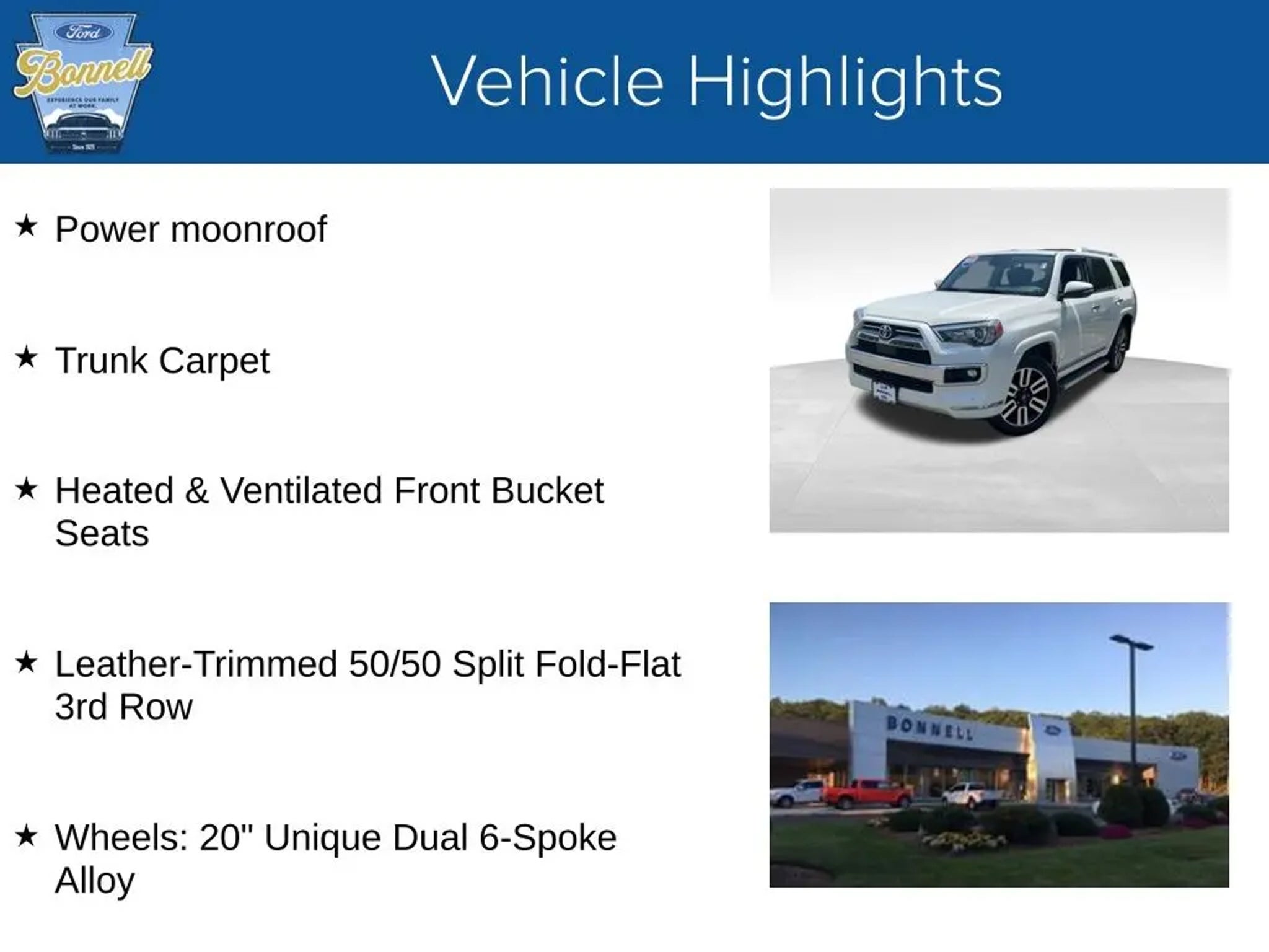 Blizzard Pearl 2023 Toyota 4Runner Limited 4WD 5-Speed with ECT 4.0L V6 DOHC 24V 4WD, Black/Graphite w/Leather Seat Trim, Apple CarPlay/Android Auto, Heated & Ventilated Front Bucket Seats, Leather-Trimmed 50/50 Split Fold-Flat 3rd Row, Navigation System, Power moonroof, Radio: Premium Audio w/JBL, Trunk Carpet, Wheels: 20 Unique Dual 6-Spoke Alloy. Recent Arrival! Odometer is 642 miles below market average!