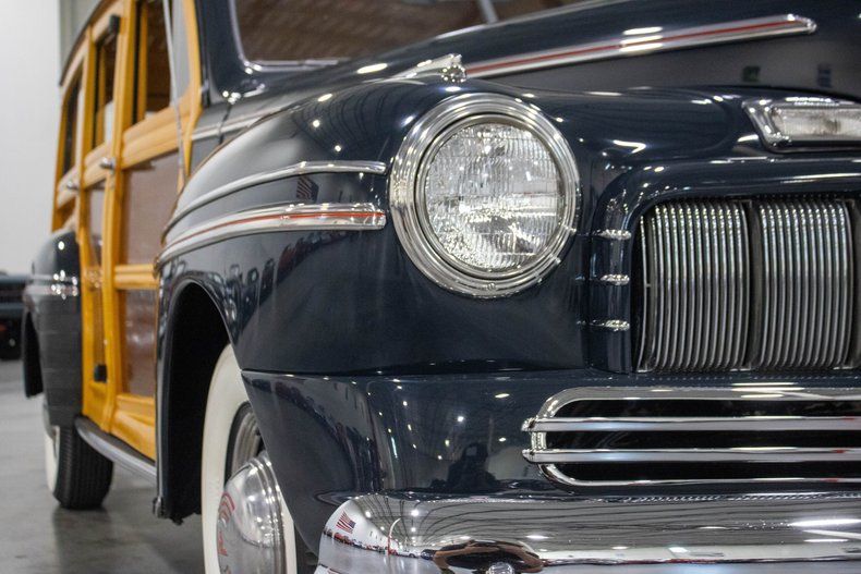 The 1946 Mercury Woody Wagon is a striking example of postwar automotive craftsmanship, combining elegance, utility, and timeless design. This particular example, a Model 69M, has been fully restored to a high standard, showcasing the beauty of its wood, steel, and interior. Its dark blue-green paint presents with a deep, rich finish that pairs beautifully with the red interior, one of only three color choices offered for these cars when new. The exterior woodwork is in stunning condition, highlighting the artisanal touch that made the Woody Wagon such an icon of its era.