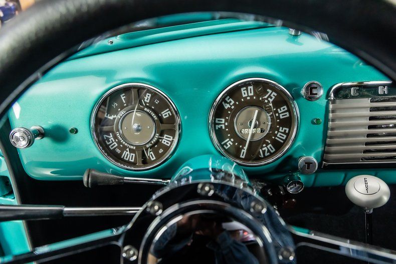 Inside, the interior of this 1953 3100 is Completely Restored and Upgraded! Take a look inside to see the Grey Upholstered Bench Seat, Black Carpeting, New Door Panels, Body Color Matched Dashboard, New Headliner, Factory Audio System, Custom Steering Wheel, and Custom Gauges! Underneath Features a Black Painted Frame, Front Sway Bar, Factory Battery Location, Custom Fuel Tank and a Dual Exhaust System!