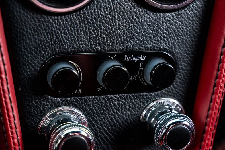 Inside, the car combines heritage with refinement. Upholstery by Steve Holcomb wraps the cabin in rich red leather with black suede inserts, covering the seats, dash, console, and custom panels. The seats provide bolstered modern comfort, while Dakota Digital gauges preserve factory styling with updated function. A period-correct Antique Automobile Radio head unit hides modern Bluetooth connectivity, paired with an Alpine amplifier and modern speakers for high-quality sound. Vintage Air climate control ensures comfort in any weather, while dimmable LED ambient lighting adds a modern touch that enhances the cabin's atmosphere. Above, a custom alcantara headliner with leather-wrapped sunvisors adds an extra layer of detail. Every surface has been tailored with precision, and even the doors close with the solid, confident sound of a modern luxury car.