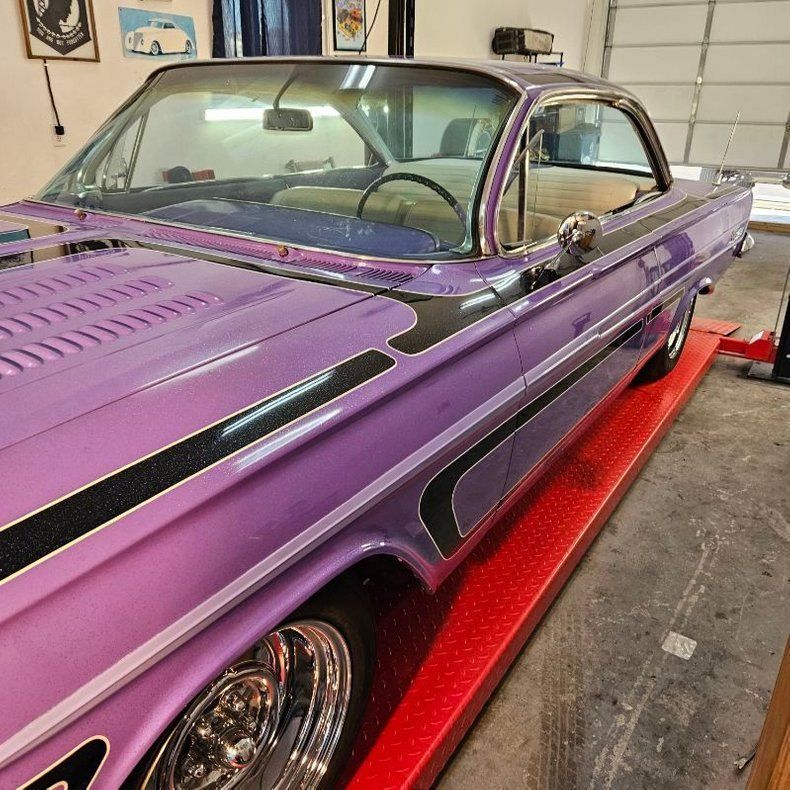 CONDITION This 1961 Chevrolet Impala Custom is a stunning and highly detailed build with attention given to every aspect of performance and style. The exterior presents a vibrant purple finish with custom detailing that enhances its classic bubble-top silhouette. Inside, the white interior remains in very good condition, showing only minimal age-related wear. The engine bay is exceptionally clean, featuring a 350 V8 with modern upgrades for reliability and performance, including a CVF serpentine system and a 4-core aluminum radiator with electric dual fans. The undercarriage shows solid structure and clean suspension components. This Impala runs strong, shifts smoothly, and offers both vintage appeal and modern comfort with its ice-cold air conditioning.