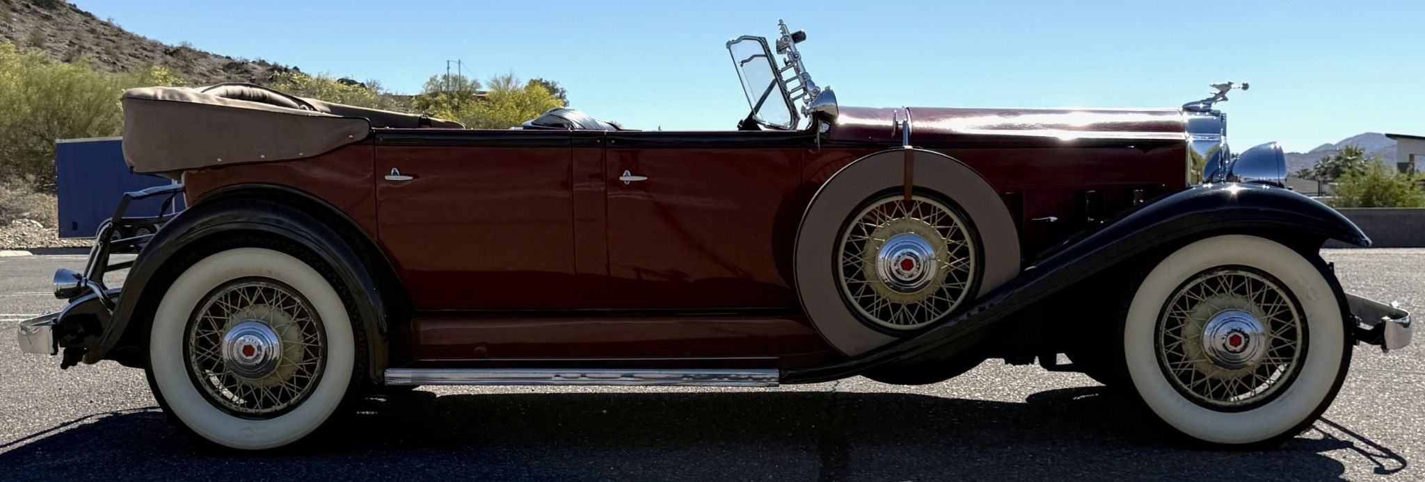 The 1932 Packard Model 902 Phaeton represents one of the finest expressions of prewar American luxury, craftsmanship, and engineering excellence. This four-passenger open touring car was part of Packards celebrated Standard Eight line, powered by a robust 320 cubic inch inline eight-cylinder engine delivering 110 horsepower through a four-speed manual transmission. Chassis number 501-46 has been preserved in largely original condition, showing 91,713 miles believed to be from new. The Packard remains a fine candidate for continued preservation, local touring, or CCCA Full Classic events where its authenticity and history will be greatly admired. Delivered new on March 24, 1933, through Suburban Motor Company in Burlingame, California, this Packard passed into the current owner's family over 80 years ago. The original vehicle number plate remains affixed to the firewall, confirming its authenticity as an original-bodied Phaeton that left the factory in 1932. According to family history, this Packard is said to have connections to Hollywood, though those who knew the exact story have since passed on. Regardless, its California provenance and long-term family ownership add significantly to its historical appeal. This example stands as a remarkable survivor that offers a direct link to one of Packards most elegant and enduring eras. The exterior presentation of this Packard is stately and refined. The long 136.5-inch wheelbase body is straight and well-proportioned, finished in a distinguished tri-tone color scheme of burgundy with darker black character lines and black fenders. The finish remains in good condition with attractive depth and gloss, while the yellow-painted chrome spoke wheels display some light rust consistent with age. Dual side-mounted whitewall spares, dual spotlights, a rear-mounted trunk rack, and the signature Goddess of Speed radiator mascot complete the cars imposing and authentic presentation. The new tan broadcloth convertible top and cover are in excellent condition, fitted to the original wood and chrome top frame, which may benefit from minor maintenance. The interior of the Packard is inviting and well-preserved, retaining much of its original character. The black naugahyde upholstery remains in very good condition, complemented by newly fitted black carpeting. The original faux-woodgrain painted dashboard houses the correct gauges and retains a pleasing patina, a testament to its age and authenticity. The rear passenger compartment features its original faux-woodgrain painted footplate, plated chrome hand and foot bars, and functional storage pockets on all four doors, all of which remain in very good condition. The generous four-passenger configuration and thoughtful details reflect Packards emphasis on comfort and craftsmanship. Power is provided by Packards 320 cubic inch, L-head inline eight-cylinder engine producing 110 horsepower, paired with a four-speed manual transmission. The car rides on a solid front axle with leaf springs, a live rear axle, and four-wheel mechanical drum brakes. Chassis 501-46 drives and shifts well, demonstrating the smoothness and refinement for which Packard was known. This example remains mechanically sound and represents an excellent choice for local concours, CCCA CARavan touring, or relaxed weekend drives. For more information and details, please call or text Kendi Brown at 1.623.404.9042 or email us at sales@classicpromenade.com . This 1932 Packard Phaeton Model 902 is available for inspection at our showroom in Phoenix. We are pleased to offer FaceTime or WhatsApp live video inspections, and we help coordinate shipping worldwide. We also have financing partners if you are interested in financing.