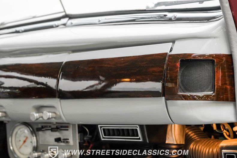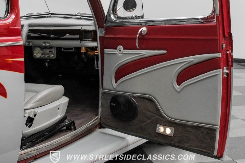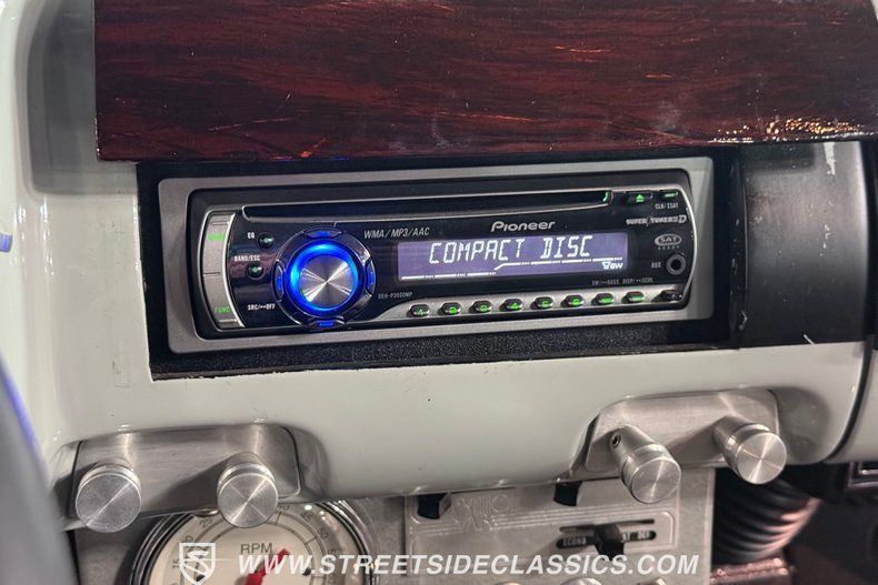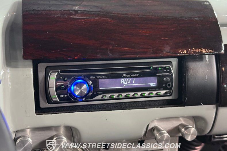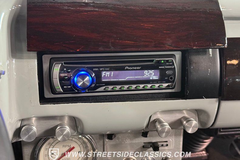 The interior offers plenty of aftermarket style, with functionality also seamlessly integrated into the mix. As you open the driver's side door, you'll notice right away how the precisely applied paint of the exterior seamlessly transitions inside. There are some outstanding custom touches on display, including a pair of ultra-comfortable front bucket seats that blend perfectly with the door panels and dash area, and an aftermarket tilt column that displays a super-sharp banjo steering wheel. Further forward, a collection of Classic Instruments gauges is recessed into the instrument panel, while just below the Vintage Air climate control system stands by to keep you and your passengers comfortable throughout the seasons. The featured power windows roll up and down without issue, the power driver's seat moves smoothly into just the right position with the push of a button, and there's a Pioneer AM/FM/CD stereo with an auxiliary port on hand to provide plenty of audio options.