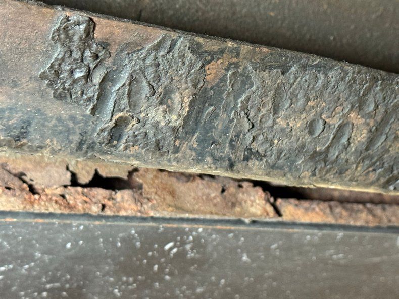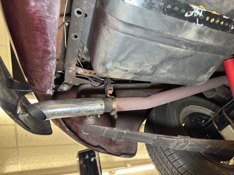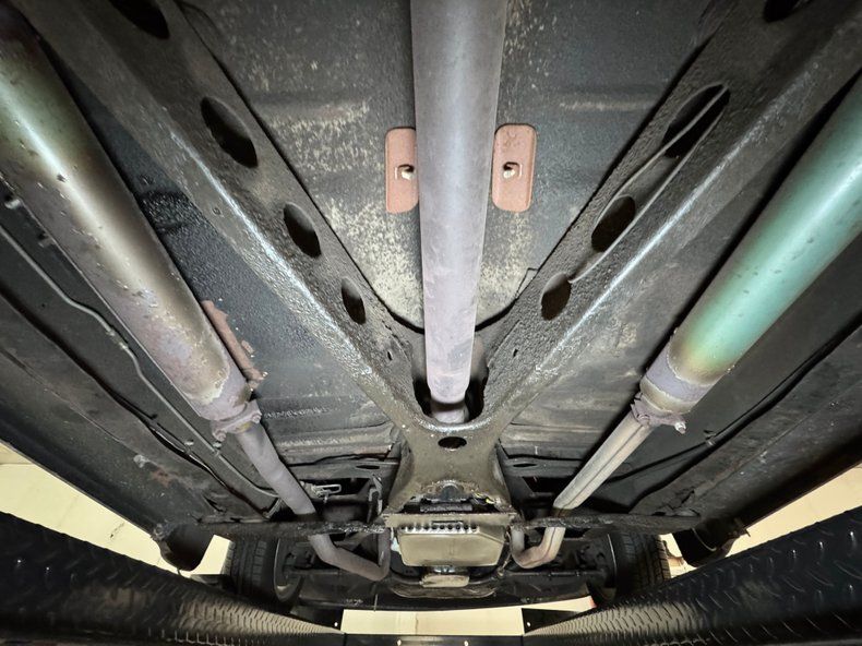 We find an X-frame and generally clean components underneath and also a good amount of swiss cheese on the inner rocker panels. Beyond that, very little surface rust and no errant fluids. Dual exhaust flows through Smithy mufflers, exiting via chrome tips behind the rear bumper. Power disc brakes are up front with power drums in back and suspension consists of coil springs in front and leaf springs in back.