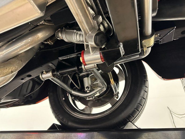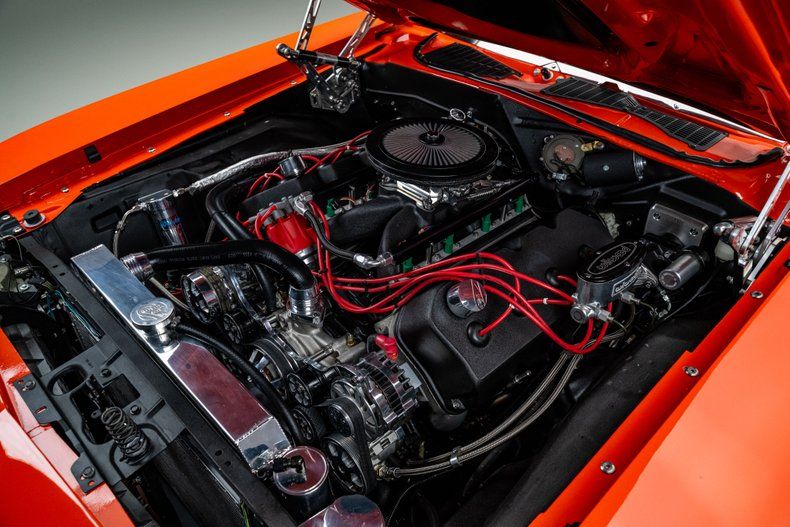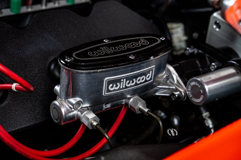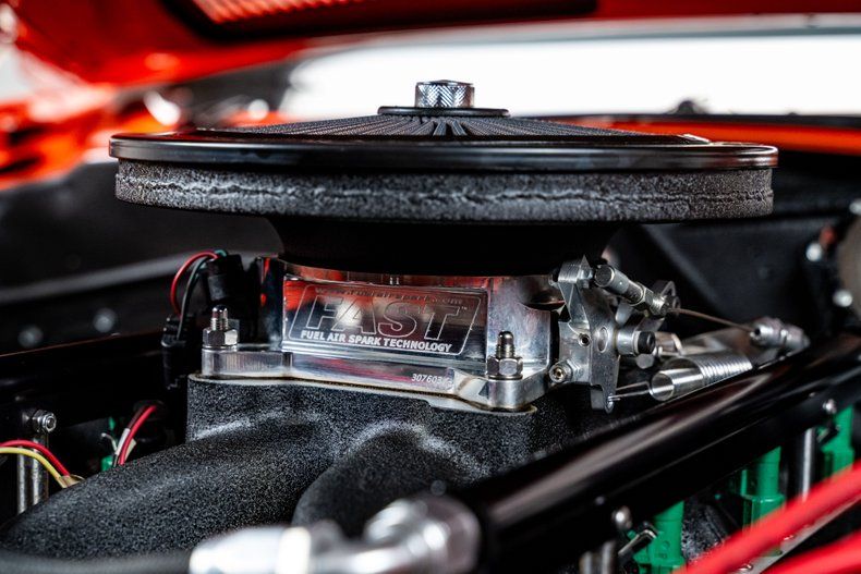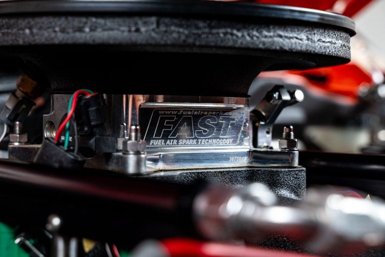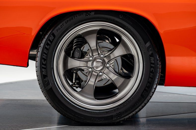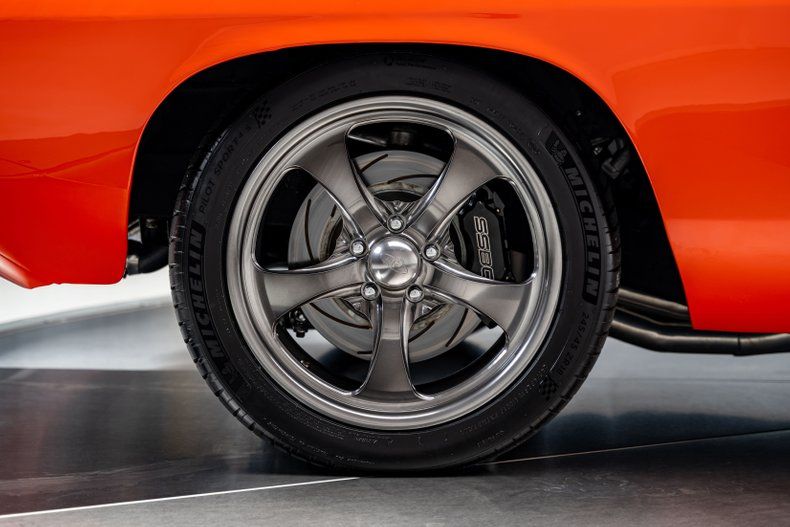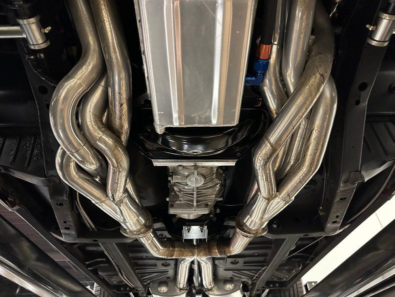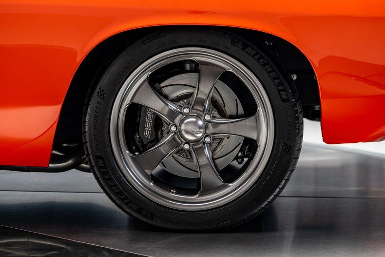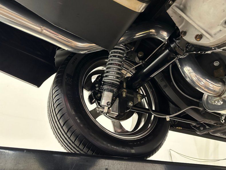 Backing the engine is a Tremec TKO500 5-speed manual transmission with a hydraulic clutch and a Hurst Pistol Grip shifter. Power moves to the pavement through a Moser Dana 60 rear axle with 3.73 gears. The chassis was upgraded with an RMS AlterKtion front suspension and QA1 coilovers, paired with a Ridetech 4-link rear setup that keeps the stance planted under acceleration. Braking is handled by SSBC calipers clamping slotted rotors with a Wilwood reservoir assisted by a Hydratech hydraulic boost system. Steering is quick and precise thanks to power rack-and-pinion hardware mounted to an Ididit tilt column. Intro Pentia billet wheels, 18" up front and 19" in the rear, wear Michelin Pilot Sport 4S tires measuring 245mm front and 295mm rear that give the car a modern footprint.