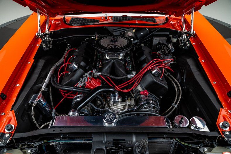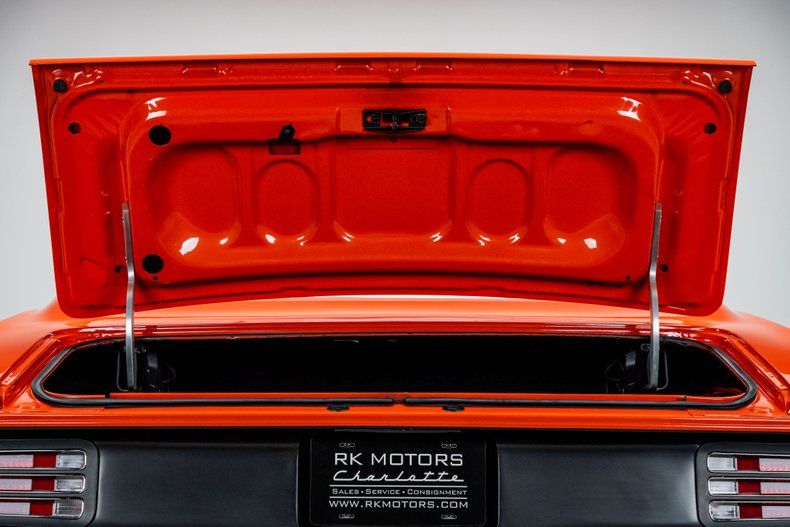 Finished in Hemi Orange and detailed with a HEMI hockey stripe, the car wears a mix of factory lines and subtle metalwork that make it both recognizable and distinct. The front valance was extended and reshaped, the rear valance molded in, and the rockers stretched to conceal the pinch welds. Marker lights were shaved, bumpers were tucked tight to the body, and Harley-Davidson Road King driving lamps were integrated into the front valance and feature LED turn signals. The look is cohesive and confident, showing how far refinement can go without losing character. Every inch was designed to modernize the E-body's aggression while preserving its silhouette.