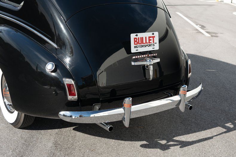 Description: This 1940 Mercury Eight four-door town sedan was refurbished and powered by a 239ci flathead V8 linked to a three-speed manual transmission, the car is finished in black over beige cloth upholstery. Equipment includes 15 steel wheels, hubcaps and trim rings, whitewall tires, dual side mirrors, a glovebox-mounted dashboard clock, an AM/FM/cassette stereo, and lap belts.