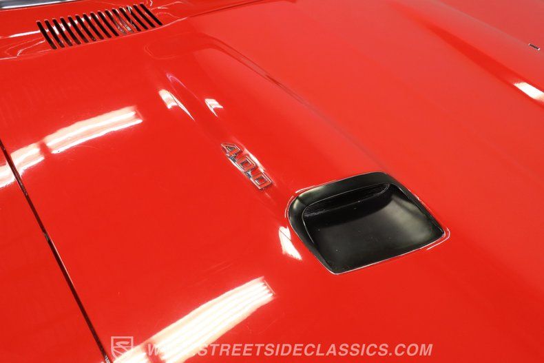 Under the hood, we find a clean engine bay with a 400-cubic-inch overhead-valve V-8. Fed by that FiTech electronic fuel injection system, this V8 expels spent gases through a true dual exhaust. That power is routed through a tried-and-true Muncie four-speed manual transmission before being sent out to the ten-bolt rear end.