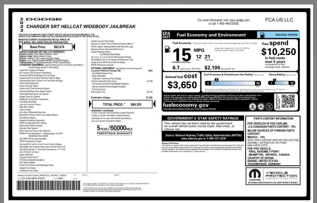 2023 Dodge Charger SRT Hellcat Jailbreak for sale! This 2023 Dodge Charger SRT Hellcat Jailbreak is a true American muscle icon, delivering uncompromising power and aggressive style in a rare, highly personalized package. Aside from the factory warranty this Charger also comes with a 5-year Mopar extended warranty valued at $6,000! Under the hood, the legendary 6.2L supercharged HEMI V8 engine roars to life with 717 horsepower and 650 lb-ft of torque, channeled through a quick-shifting 8-speed automatic transmission for relentless acceleration and track-ready performance. The Jailbreak edition allows for extensive customization, letting owners tailor everything from exhaust tips to floor mats, ensuring each car is as unique as its driver. With its widebody stance, aggressive fascias, and high-performance Brembo brakes, this Charger commands attention on the street and dominates on the drag strip. Inside, premium features such as heated steering wheel, dual-zone climate control, and advanced safety systems provide comfort and confidence for spirited driving. With only 14,679 miles and a clean history, this Hellcat Jailbreak is a rare opportunity for collectors seeking a modern muscle masterpiece with unmatched presence and performance.