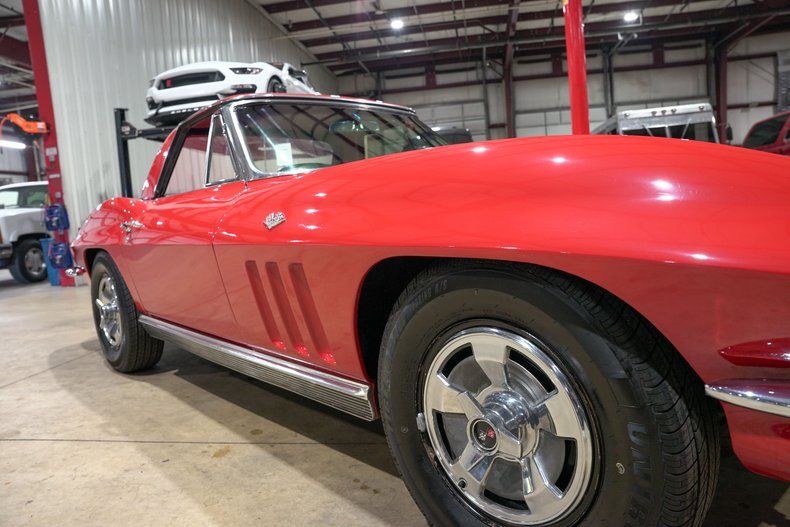 This 1966 Corvette Convertible was delivered new at Robert DeNoyer Chevrolet of Holland, MI on May 12, 1966. The car was ordered with the L79 327 / 350 motor, 4 speed Muncie manual transmission and a 3:70:1 Positraction Rear end. The car was delivered dressed in Rally Red exterior paint over Black Vinyl interior with White convertible top and matching Rally Red hard top. Other highlights included chrome spinner hubcaps, classic teak 3 spoke steering wheel, 7000 RPM tach, 160 MPH speedometer, clock, bucket seats etc.