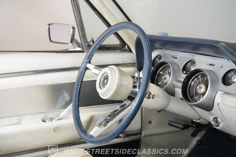 Inside, the Mustang offers a vintage cabin with a vinyl interior that maintains its classic charm. The seats show natural wear with some scuff marks and minor tears, reflecting years of enjoyment. Both bucket seats and the rear bench provide comfortable seating, complemented by a center console with normal use marks. The dashboard and door panels feature authentic scratches and cracks, adding character to the interior. Functional air conditioning, heating, and defrost systems ensure a comfortable ride, making the driving experience as pleasant as it is stylish.