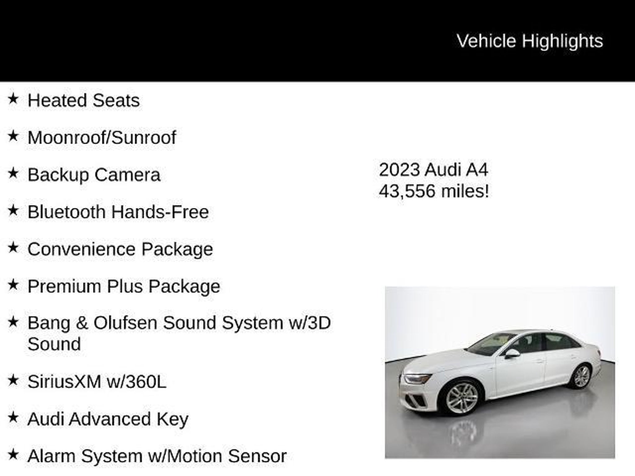 2023 Ibis White Audi A4 45 S line Premium Plus quattro quattro 7-Speed Automatic S tronic 2.0L TFSI This Audi A4 has many features and is well equipped including, Heated Seats, Moonroof/Sunroof, Backup Camera, Bluetooth Hands-Free, A4 45 S line Premium Plus quattro, quattro, 2 Rear USB Charge Ports, Adaptive Cruise Control, Alarm System w/Motion Sensor, Audi Active Lane Assist, Audi Advanced Key, Audi Phone Box, Audi Side Assist w/Pre Sense Rear, Audi Virtual Cockpit Plus, Auto-Dimming Exterior Mirrors w/Memory, Bang & Olufsen Sound System w/3D Sound, Convenience Package, Hands-On Detection Steering Wheel, Heated Steering Wheel, Leatherette Covered Center Console & Door Armrests, Memory for Driver's Seat, Parking System Plus, Power Folding Exterior Mirrors, Premium Plus Package, SiriusXM w/360L, Top View Camera System, Traffic Jam Assist. Choosing a DAHL USED CAR ADVANTAGE vehicle will give you the confidence your decision is a sound investment. A Dahl UCA vehicle provides you with a 7 month/7,000 mile powertrain limited warranty. A fully comprehensive 169-point inspection conducted by a factory-trained technician. A complete Superior Vehicle Detail. 3-day money back guarantee or 30-day easy exchange option. Plus a complimentary Autocheck vehicle history report. If only all life's decisions were this easy. To ensure that your recently purchased fantastic-looking 2023 Audi A4 remains in tip-top condition, we include the first scheduled maintenance appointment with every vehicle purchased.