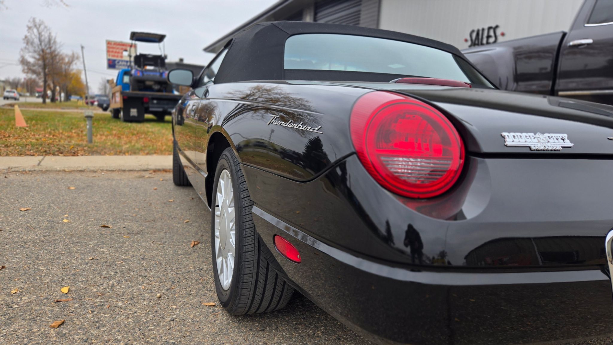 2002 Ford Thunderbird Roadster. Triple black car with black paint, black leather interior and black fabric top, plus a black removable hardtop with porthole window included. This is one incredible car with a single owner, and only 9,900 kms original kms. The car was unsold at a Ford dealership in Meadow Lake for two years and eventually was traded to Dodge City in Saskatoon in 2004. The car had never been registered and at the time only had 100 kms on the odometer, making the current owner the first and only owner despite the mismatched dealership tag. This vehicle is in incredible condition and shows absolutely no wear. Its immaculately clean and everything is in perfect working order. The car has received an oil change every year since new, despite the low kms, but all other fluids are original and the Michelin tires on the car were also installed at the factory. Hard to find a collector car with this low of milage and in this kind of condition. Factory flawless and nearly impossible to find them in this condition. Truly a new vehicle. Stand for the removable top comes with the car.