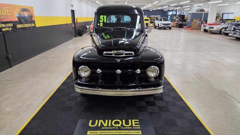 Classic 1951 Ford F1 panel truck with flathead V8 engine and 3-speed manual transmission Black paint with custom red flame accents Dual exhaust, a Holley 4bbl carb, aluminum heads and intake, and electric radiator fan Air conditioning installed but requires service to blow cold, brake maintenance recommended Recently installed new clutch and master cylinder