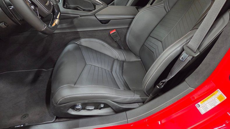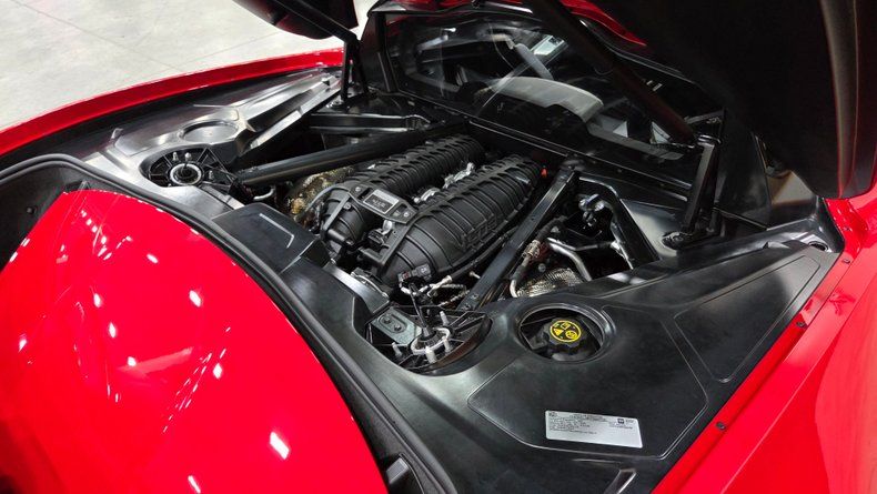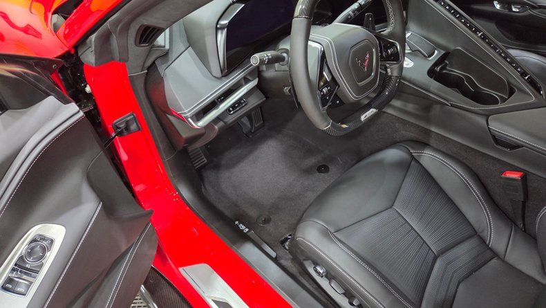 2023 Chevrolet Corvette Z06 3LZ. Torch Red paint, and a jet black interior. Only 599 actual miles on the odometer and comes with a clean Carfax report indicating one owner and no accidents. Z06 Ultimate Performance package, which adds Brembo ceramic brakes, the carbon fiber arrow package with aerodynamic enhancements such as a high wing, dive planes, and carbon fiber ground effects. 5.5-liter V8 engine paired with an 8-speed dual-clutch automatic transmission, delivering a remarkable blend of performance and refinement. Impressive engine sound and mid-engined performance. The car rides on Michelin Cup 2 radial tires and features the advanced ZL7 suspension system. Great condition, with amazing paint and an untouched interior that looks nearly brand new. The interior hosts multiple amenities such as a heads-up display, heated and ventilated seats, and overhead is a removable top for open-air driving. Additional practical features include front and rear storage compartments.