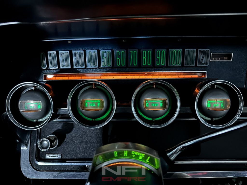 Inside, the Thunderbird's design continues to set it apart. The ribbon-style speedometer uses a horizontal bar that glides across a linear scale rather than a rotating needle, flanked by matching horizontal gauges for fuel, temperature, oil pressure, and alternator output. The layout was inspired by aircraft instrumentation and was considered futuristic for the time. At night, the cluster emits a soft green-blue glow, and despite the modern appearance, the system is still mechanically driven by a traditional cable from the transmission.