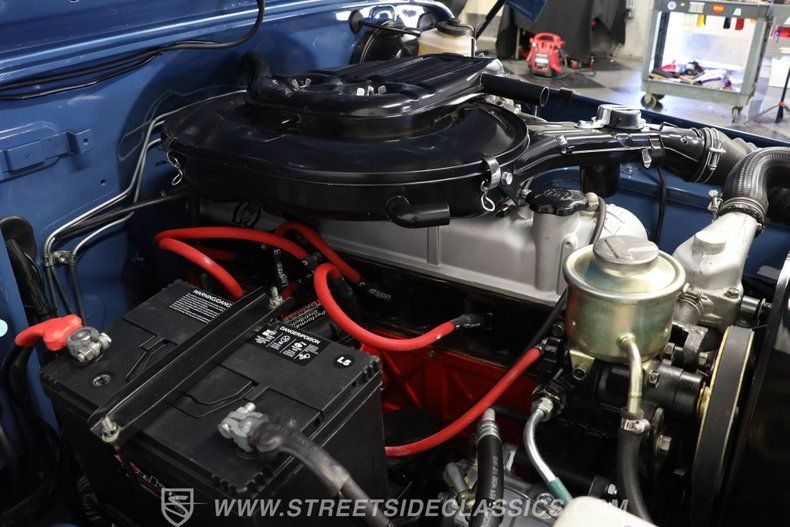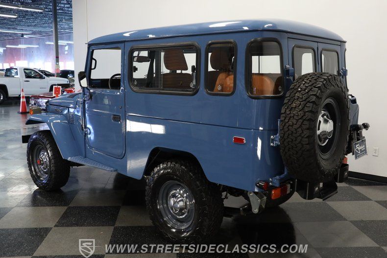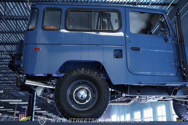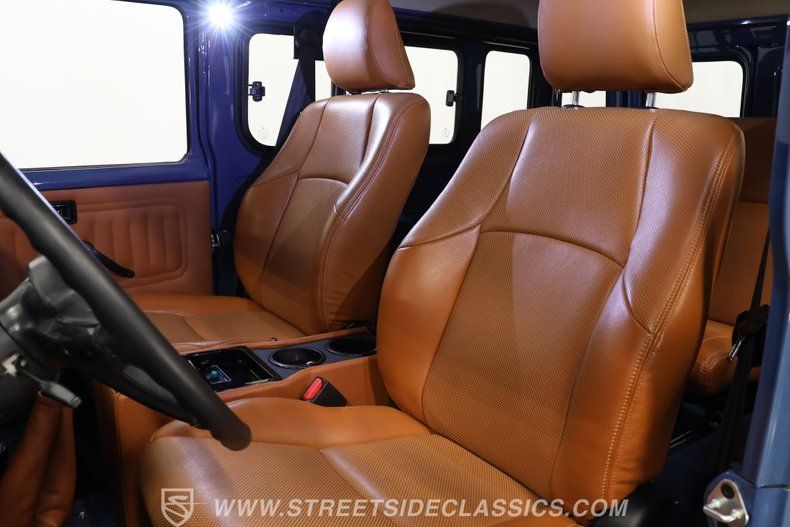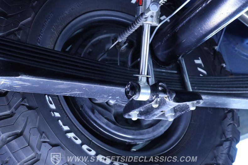 Under the hood, this Land Cruiser houses a robust 4.2L inline six-cylinder engine, paired with a smooth-shifting 5-speed manual transmission. The engine bay shines with fresh blue paint, continuing the exterior's theme, and features a single 2-barrel carburetor, factory-style intake and exhaust manifolds, and an upgraded aluminum radiator to keep things cool. The drivetrain boasts power brakes with front discs, power steering, and an upgraded suspension with Rough Country shocks, delivering a driving experience that is both commanding and comfortable. This truck is as capable on the road as it is off the beaten path.