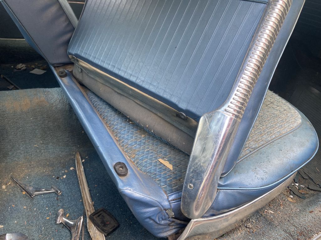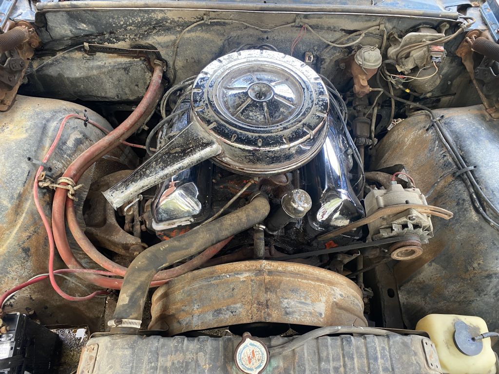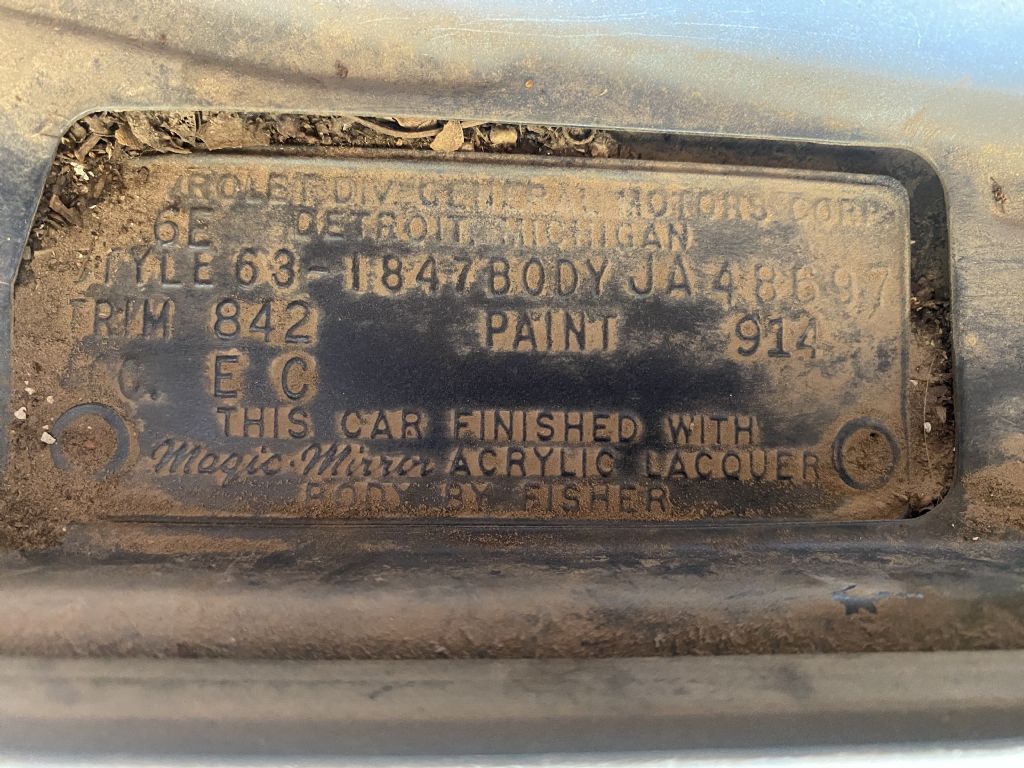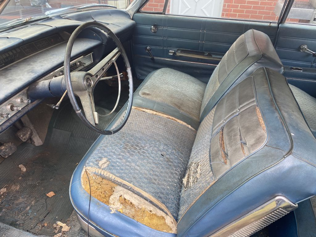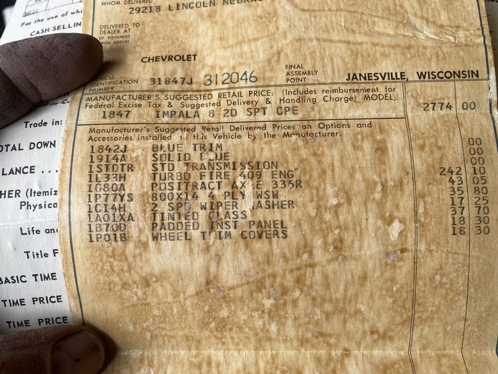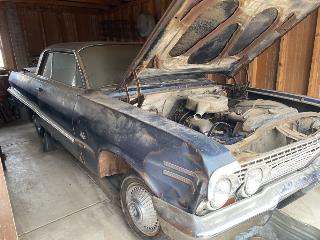 1963 Impala 409 -3 speed on the column. Very rare combination! One owner- ordered as such. Has original invoice, window sticker, and sales papers. Incredibly rare with column shift and bench seat that has been sitting in a home garage for 40+ years. The body has some typical rust issues and dents, but mostly original paint. Stainless trim and glass are in good condition. The original interior is worn as expected. The engine has never been apart, and it still starts and runs, but the car will need basic restoration to be a driver. Bench seat, standard trim. Great find for the Impala lover who is looking for a unique project. 402-474-2344. we also have a 64 Impala parts car from Tx. that has a very solid floor and lower section that could be used for the restoration of this car.