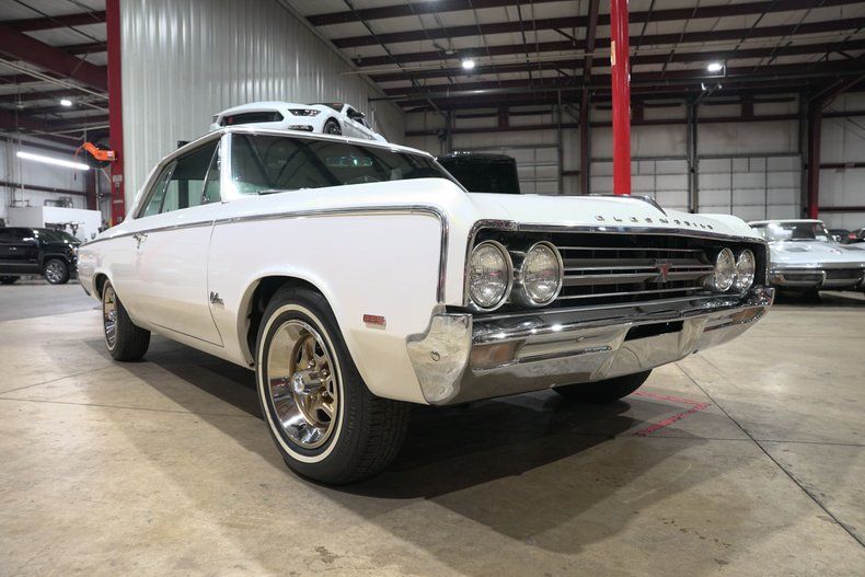 GR Auto Gallery is excited to present this 1964 Oldsmobile Cutlass 442 finished in a striking white pearl that shows off every curve of the first year for the legendary 442 package. The vinyl black top adds a sharp period contrast while the gold and chrome Hurst wheels immediately tell you this car means business. The stance is confident the lines are clean and the overall look is unmistakably early muscle. This one even features a glass roof adding a rare touch of openness and style you almost never see on a '64.