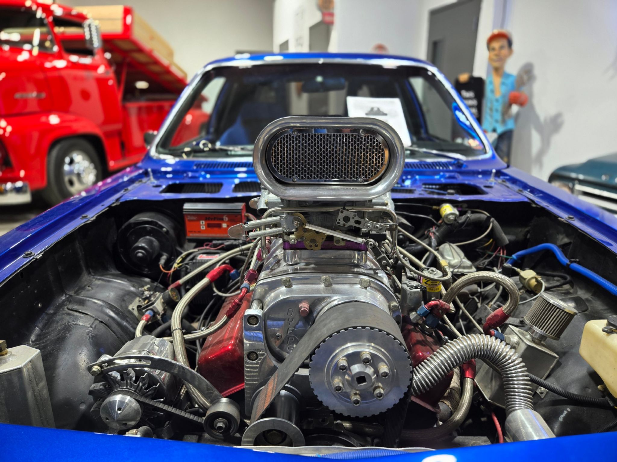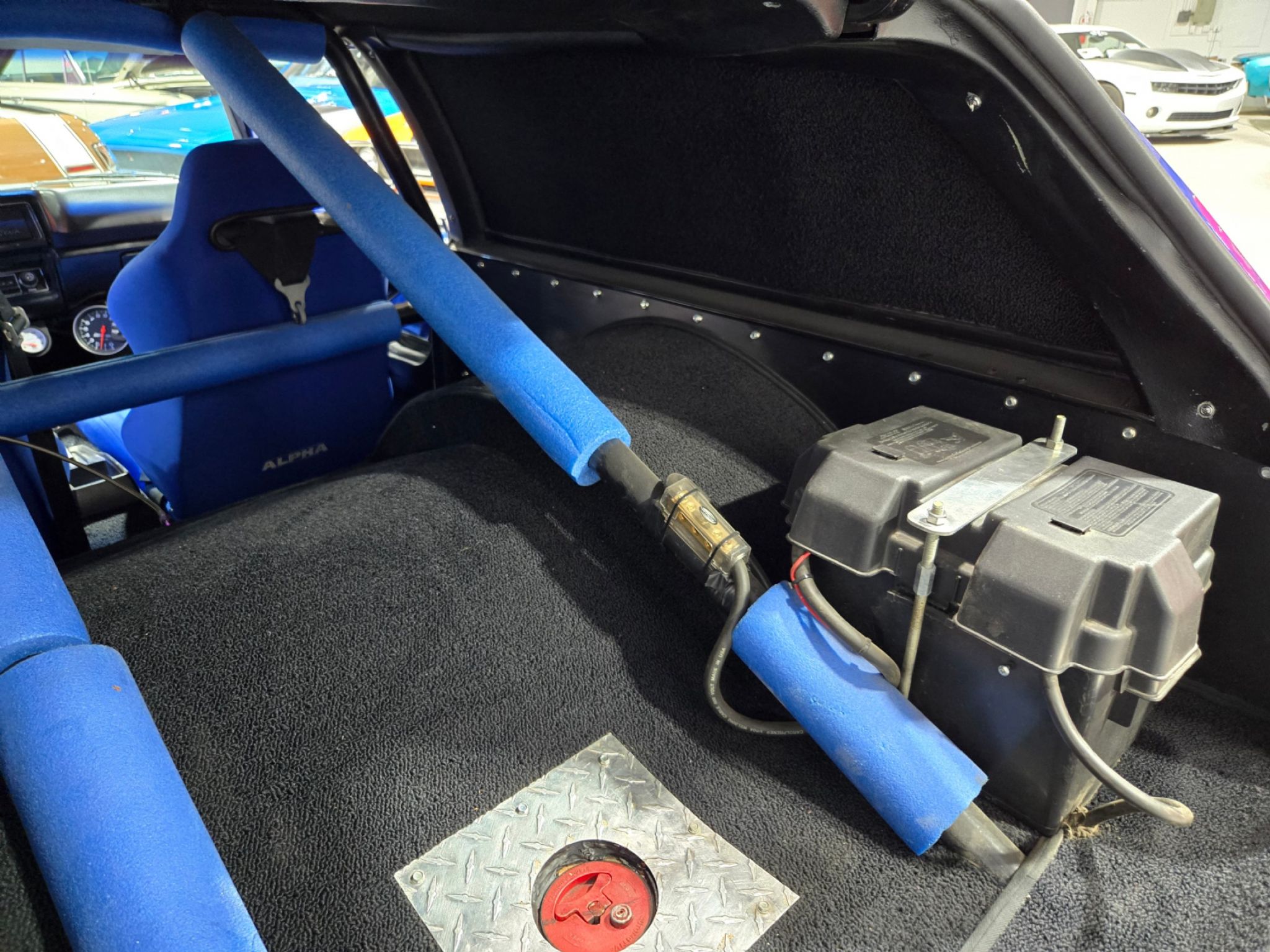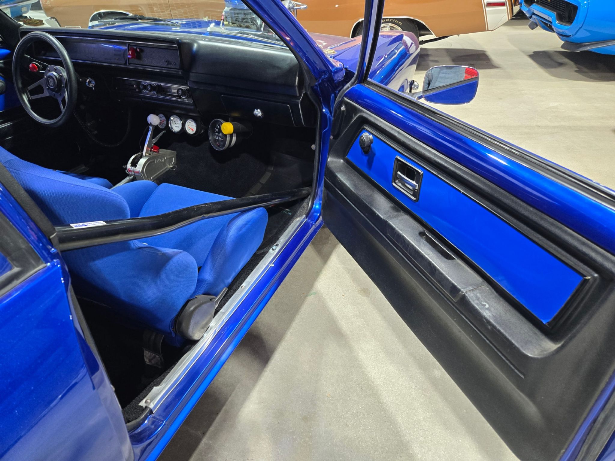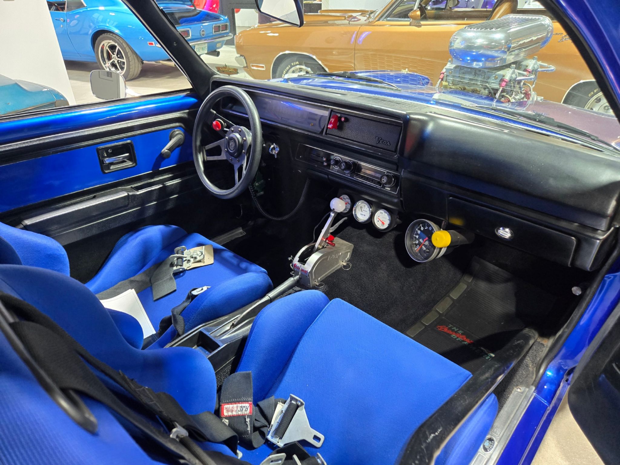 1975 Chevrolet Vega 2-dr Wagon Blown Pro Street. This is one crazy Grocery Getter The 2-dr wagons are rare to begin with. Now this one has major attitude. Under the hood is a small block 350 with alloy heads, dual Holley carbs and intake and a 671 Dyers blower on top. Its amazing that the little Vega actually manages to swallow most of the engine with just a bit of the blower poking out of the hood. Behind that is a TH-400 with trans brake. Its set up for nitrous, but theres no bottle currently. There still a bit of the original interior left, the dash is in very nice shape, but now theres racing buckets with 5-point harnesses, a roll cage and in place of the rear seat is one giant tub running from fender to fender to accommodate the huge slicks out back. The tires are wider than the rear axle! That short axle is a Dana 60 with 4:10 gears. A fuel cell is located under the trunk floor, and the battery is now out back. Its got line lock and lots of extra gauges to mange the vitals as well as a racing shifter for the automatic trans, which has a manual valve body. The Roll cage has a removable section for the driver which is nice. Its a pleasant surprise how well the car is tuned. It fires up instantly and idles well. It sounds killer (obviously). The paint is very well done from top to bottom in an electric blue thats very striking and grocery getter graphics have been added to the rear window fill panels on each side. Some history of the car is known, thanks to a customer who recognized the car. He shared the VIN with his dad, and in fact this is the car that his mom drove around in from 1977 till 1982! At that time, it had a 4-cylinder and a manual transmission. Apparently, it did a few family vacation road trips to California and Florida. What a small world! The story gs that this has been a drag car in one form or another since the late 80s. It certainly stands out and turns heads and can still be easily driven to any car show. The car shows 35,000 miles, but with engine swaps, true milage unknown.