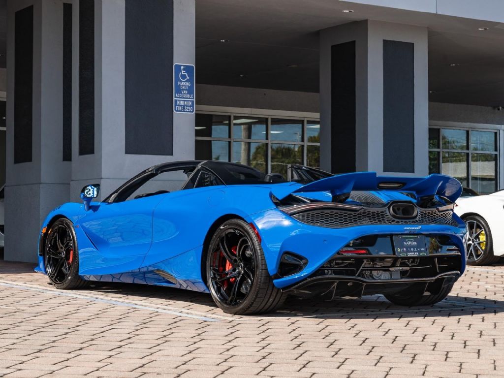 This 2024 McLaren 750S in Paris Blue over a Jet Black leather interior with just 4,592 miles is one of the most potent and engaging supercars McLaren has ever built, powered by a 4.0-liter twin turbo V8 producing 740 hp and 590 lb-ft of torque. Paired with a lightning quick 7 speed dual clutch transmission and weighing just 2,815 lbs dry, the 750S delivers staggering performance: 0–60 mph in 2.7 seconds, 0–124 mph in 7.2 seconds, and a top speed of 206 mph. Compared with the 720S it replaces, the 750S features revised aerodynamics for increased downforce, a retuned suspension with lighter springs and dampers, a quicker steering ratio, and an upgraded exhaust system that gives a sharper, more emotional soundtrack. Inside, the Carbon Black cabin offers McLaren’s driver focused layout with updated instrument displays, improved software, and optional lightweight carbon fiber bucket seats. With its low miles, breathtaking color combination, and enhanced performance refinements, this 750S represents the purest expression of McLaren’s supercar formula.