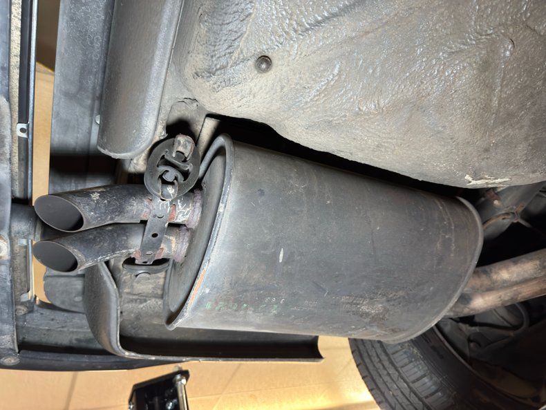Some residual oil is noted on the rear differential and transmission pan with a touch of dampness on the oil pan as well. In general, we have driver quality conditions here with typical road grime, clear knuckles, and minimal surface rust. Independent coil spring suspension is front and rear and so are power disc brakes. Dual exhaust meets at the stock style muffler in pack and exude twin tips.