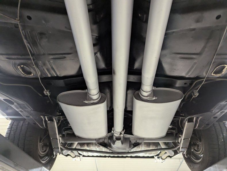 UNDERSIDE: The body was off the frame during restoration. It is exceptionally clean. The floors, braces, inner rockers appear to be nice dry metal that was prepped and painted black. It has the Rally Suspension which includes boxed rear control arms, front and rear swaybars. The steering and suspension has been gone through. It has disc brakes in front, drum in back and the e-brake is hooked up. The fuel system was replaced including the tank. It has a factory style dual exhaust system with the quad tips going out through the valence. Looking up at the motor it is clean and has a correct M-20 Muncie 4-speed manual transmission. The restored driveshaft leads back to the Safe-T-Track rear end.