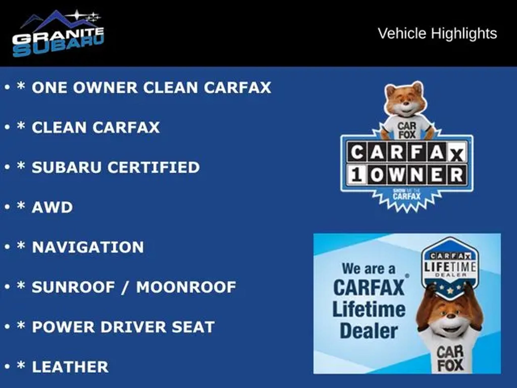 * ONE OWNER CLEAN CARFAX, * CLEAN CARFAX, * SUBARU CERTIFIED, * AWD, * NAVIGATION, * SUNROOF / MOONROOF, * POWER DRIVER SEAT, * LEATHER, * HEATED SEATS, * WINDSHIELD WIPER DEFROSTERS, * EYESIGHT, * BACKUP CAMERA, * POWER REAR GATE, * ALLOY WHEELS. At Granite Subaru in Hudson, NH we use real market data from credible 3rd parties like Edmunds so you can get a market proven price and a clear value of what your trade is worth. It's all about transparency, honesty, and integrity so you can purchase with confidence and walk away with a great deal. Our experienced sales staff is eager to share its knowledge and enthusiasm with you. We encourage you to browse our online inventory, schedule a test drive and investigate financing options. You can also request more information about a vehicle using our online form or by calling .