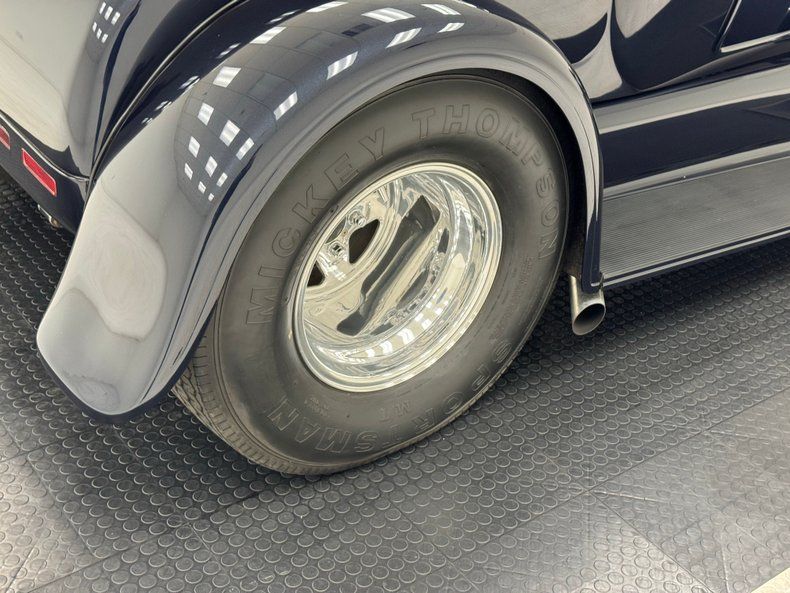 Two stage Midnight Blue coats this roadster and we're talking deep paint here and in certain light, it can look black while other light brings out the navy blue and it's nicely applied. Once you've absorbed the beauty of the paint, the wheel set up is next to compete for your attention, stacking 15-inch Weld wheels with vastly different widths and tires sizes, creating that classic hot rod stance that's been a proven winner for about 80 years, here under fiberglass fenders connected by a steel running board. In back, the rectangular quartet of tail lights get your attention right before the massive meats grab your eyes as they peek from narrow fenders. Up front, the fiberglass '32 radiator shell looks perfectly at home next to the aluminum hood which connects seamlessly to the fiberglass body. A modest windscreen with nicely sculpted posts completes the exterior which shows no glaring imperfections.