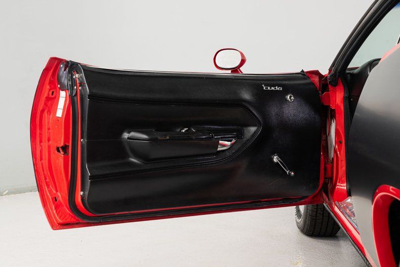 This 1970 'Cuda is a nice Hemi 'Cuda 'tribute' to that classic model as it was not originally equipped with the Hemi engine. The coupe was refinished in Red with Matte Black 'Hemi' accent designs and a black vinyl top. The exterior and bright work are in good condition.