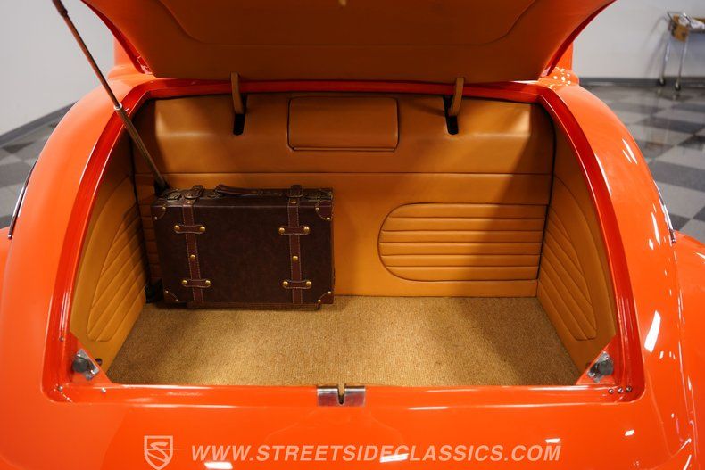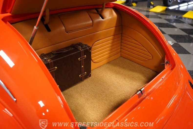 Inside, we find a beautifully appointed and fully custom tan leather interior. A Budnik custom billet steering wheel sits atop a matching tilt column. Just beyond that wheel sits a digital readout for the Wild Card electronic fuel injection system, while in the center-dash, we find a trick Dakota Digital gauge cluster. A custom center console, home to the floor-mounted Lokar shifter, completes the look. What you don't see right away are the window buttons, nor the hidden AM/FM/CD sound system, nor the fully finished trunk and included briefcase. Finally, the addition of air conditioning puts a bow on this custom cozy cabin, making it a dream to drive near or far.