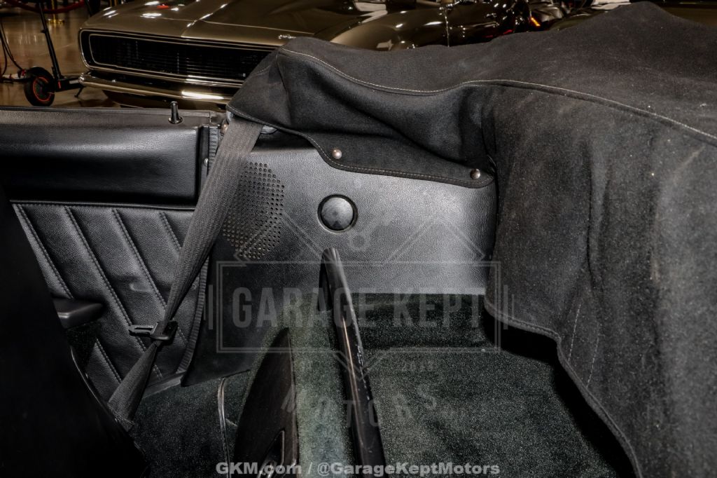 Inside, the cabin maintains its factory-correct appearance, with the black interior presenting well and complementing the car's monochromatic theme. Comfort is bolstered by functioning air conditioning, a feature not always present or operational on older convertibles. Subtle enhancements such as an upgraded stereo system improve everyday usability, while an upgraded exhaust adds a bit of character to the driving experience without detracting from the car's originality.