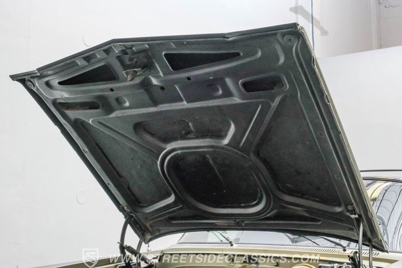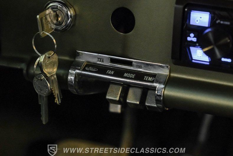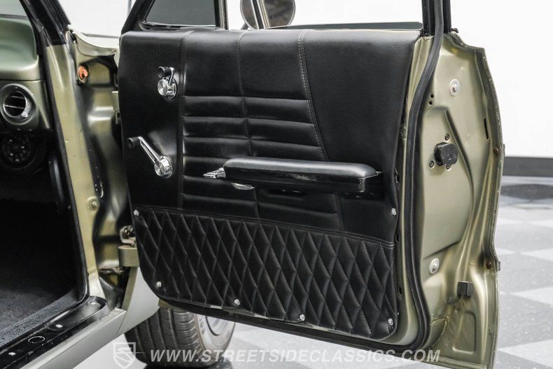 Step inside to discover a fully customized interior that balances comfort and style. The black vinyl bench seats are adorned with elegant diamond stitching and built-in cup holders for convenience. Matching door panels complement the factory dash, which is painted olive green and features Dakota digital gauges. Modern touches include a Kenwood AM/FM/Aux/Bluetooth radio paired with Fosgate speakers, while Vintage Air A/C ensures a comfortable ride. The classic factory steering wheel on a tilt column and black carpets with a black headliner complete the cohesive and inviting cabin atmosphere.