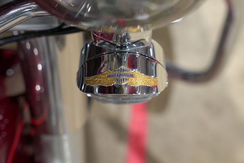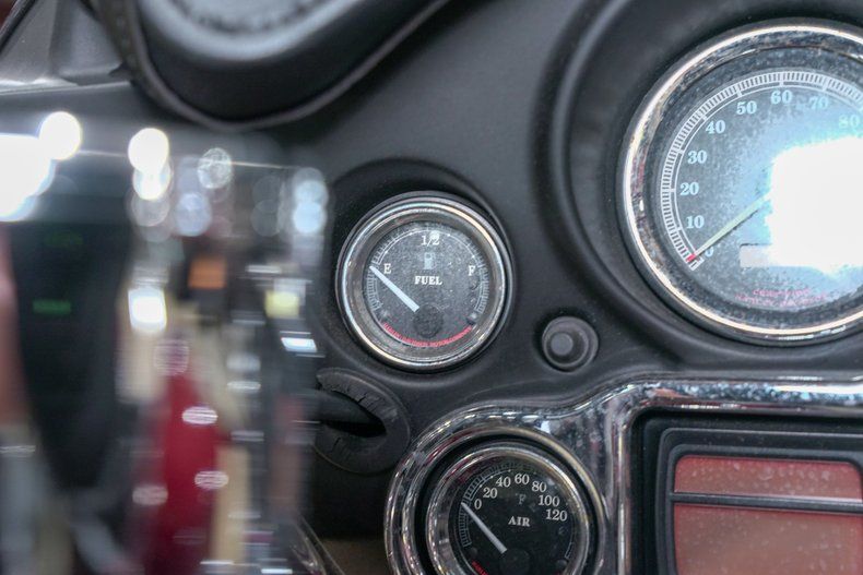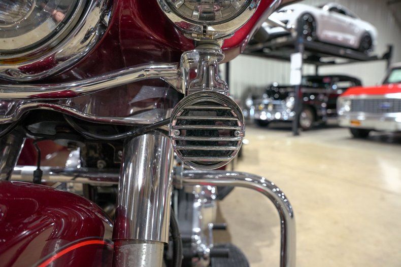 Finished in a striking red metallic paint with custom painted layers over top as well as chrome accents including the forks, wheels, headlight guards (with custom Harley badging), rider floorboards, engine covers/casing, mirrors, front fender, and engine guard, this Electric Glide is hard to miss.