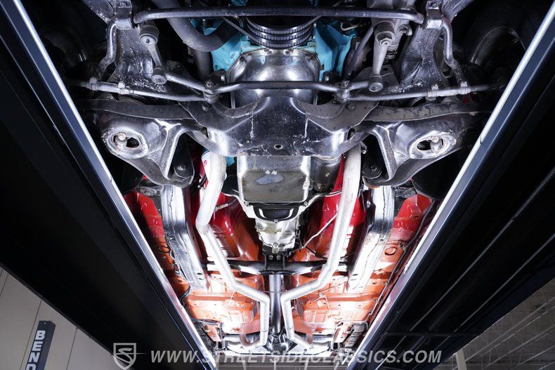 A nicely refreshed interior awaits beyond the doors, with vibrant red vinyl upholstery that shows only the slightest of wear, even on the most heavily trafficked touch points. The factory center console has been fully restored and positions a Hurst shifter within easy reach to put this coveted muscle car through its paces. Further forward, the dash area is looking strong, with clear, easily readable gauges in its instrument cluster, and a dash pad above that is free from any blemishes. Even the woodgrain finished bezel, often prone to UV damage, is in top form. A retro-style AM/FM stereo with an auxiliary port and Bluetooth connectivity is on hand to provide plenty of audio options, and the added Vintage Air climate control system works flawlessly to keep the cabin comfortable throughout the year.